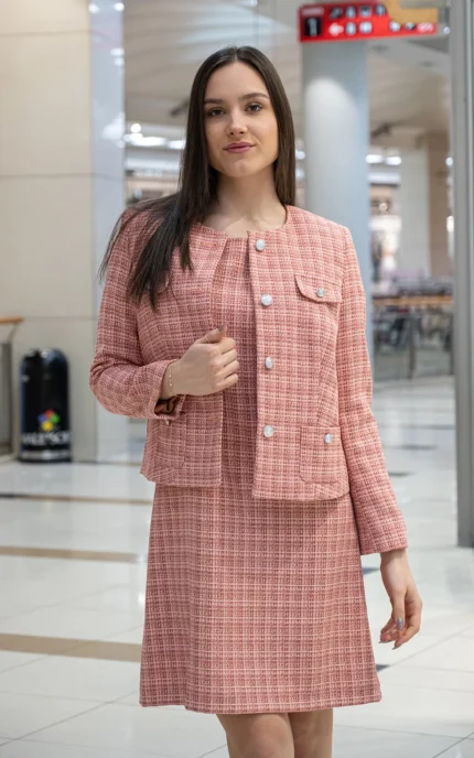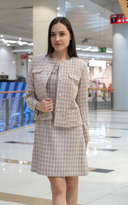107,37 € / 210,00 лв.Дамски костюм от сако от плат каре и рокля с къс ръкав