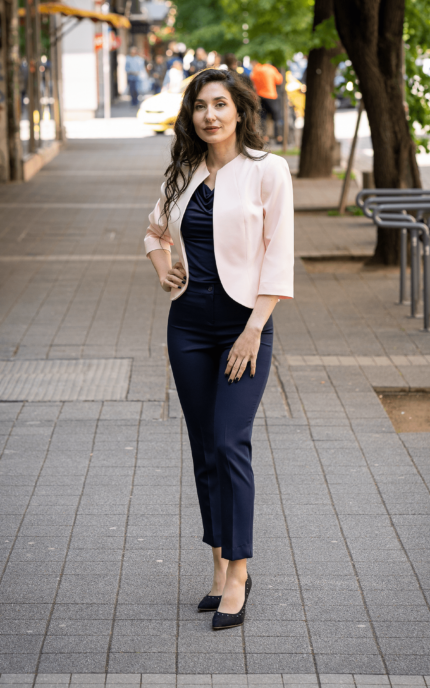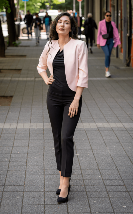 Дамски костюм от късо болеро без ревери и тесен дамски панталон