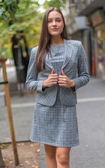 Дамски костюм от сако с остър ревер и рокля с къс ръкав