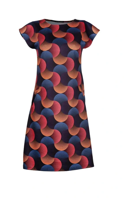 Рокля с джобове и трапецовиден силует от трико с щампа