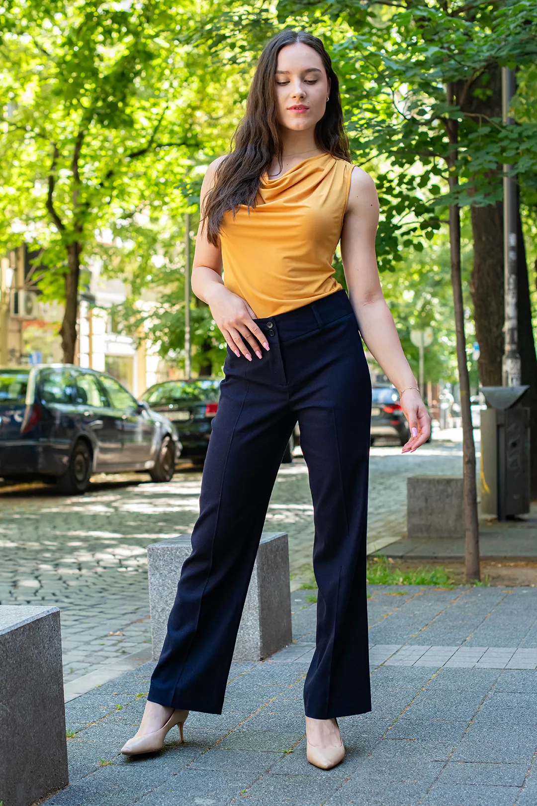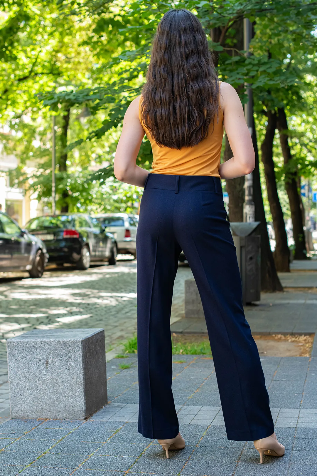 Тъмносин, широк дамски панталон с широка талия