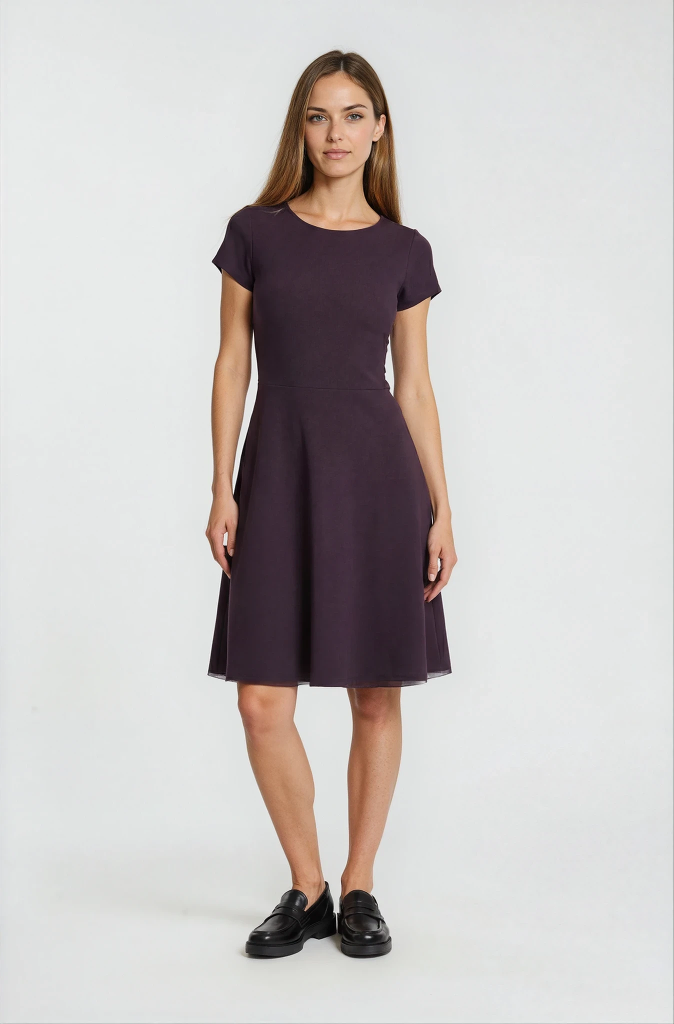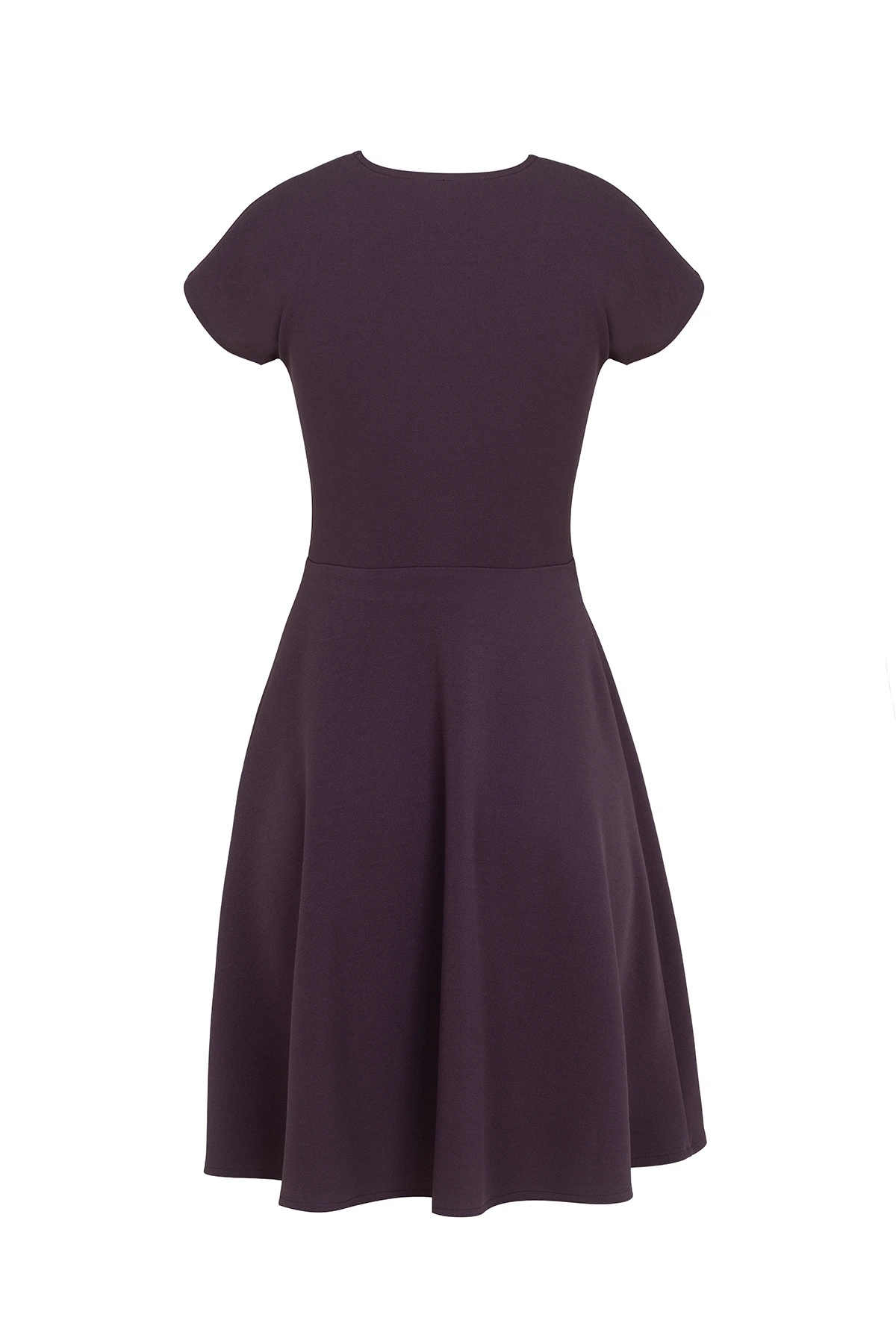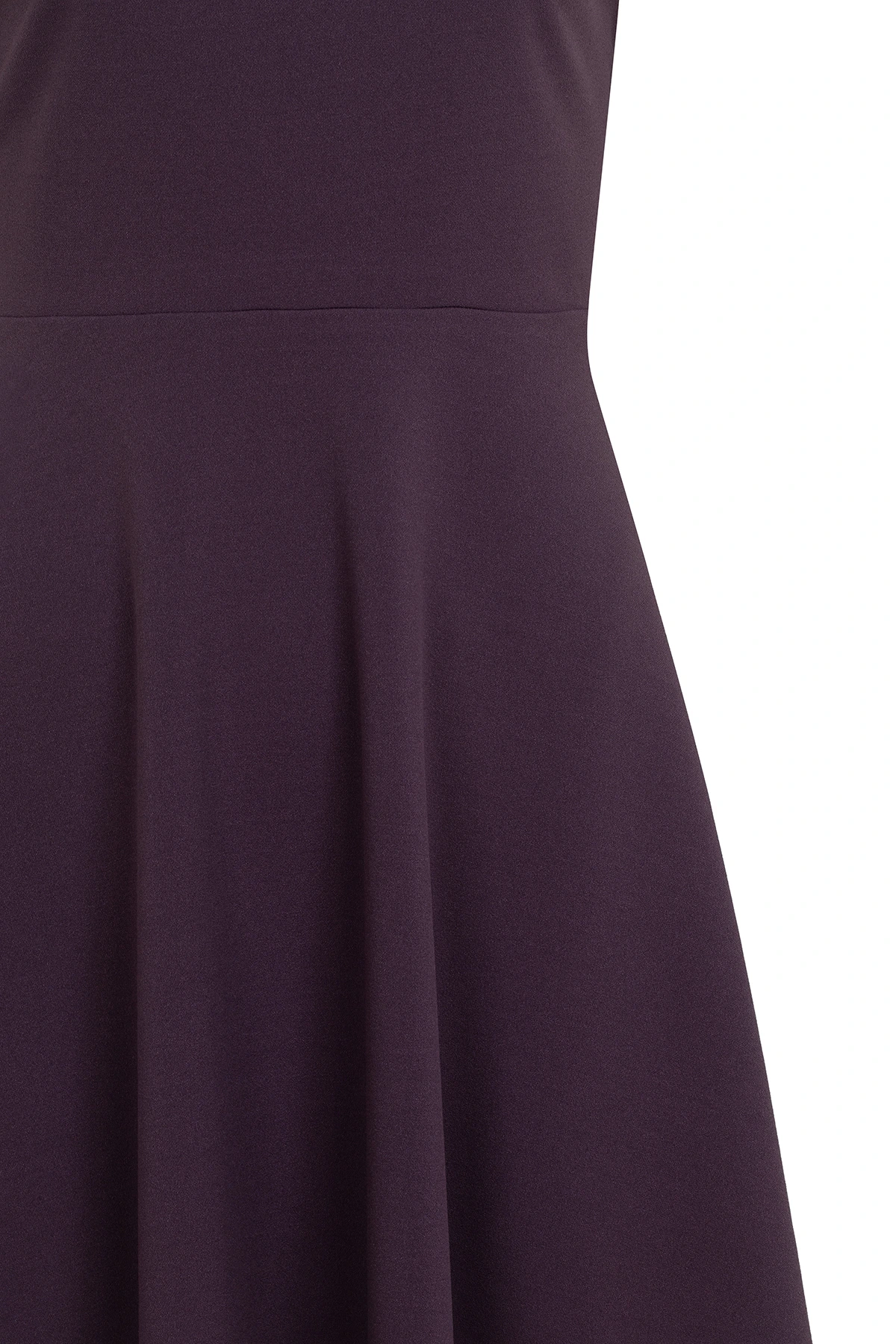 Тази рокля в наситен тъмнолилав нюанс е перфектният избор за дамите, които търсят класическа елегантност с модерен привкус. Благодарение на перфектната комбинация от вталена горна част и разкроена пола, моделът стои безупречно на всяка фигура, подчертавайки женствените извивки по най-деликатния начин.