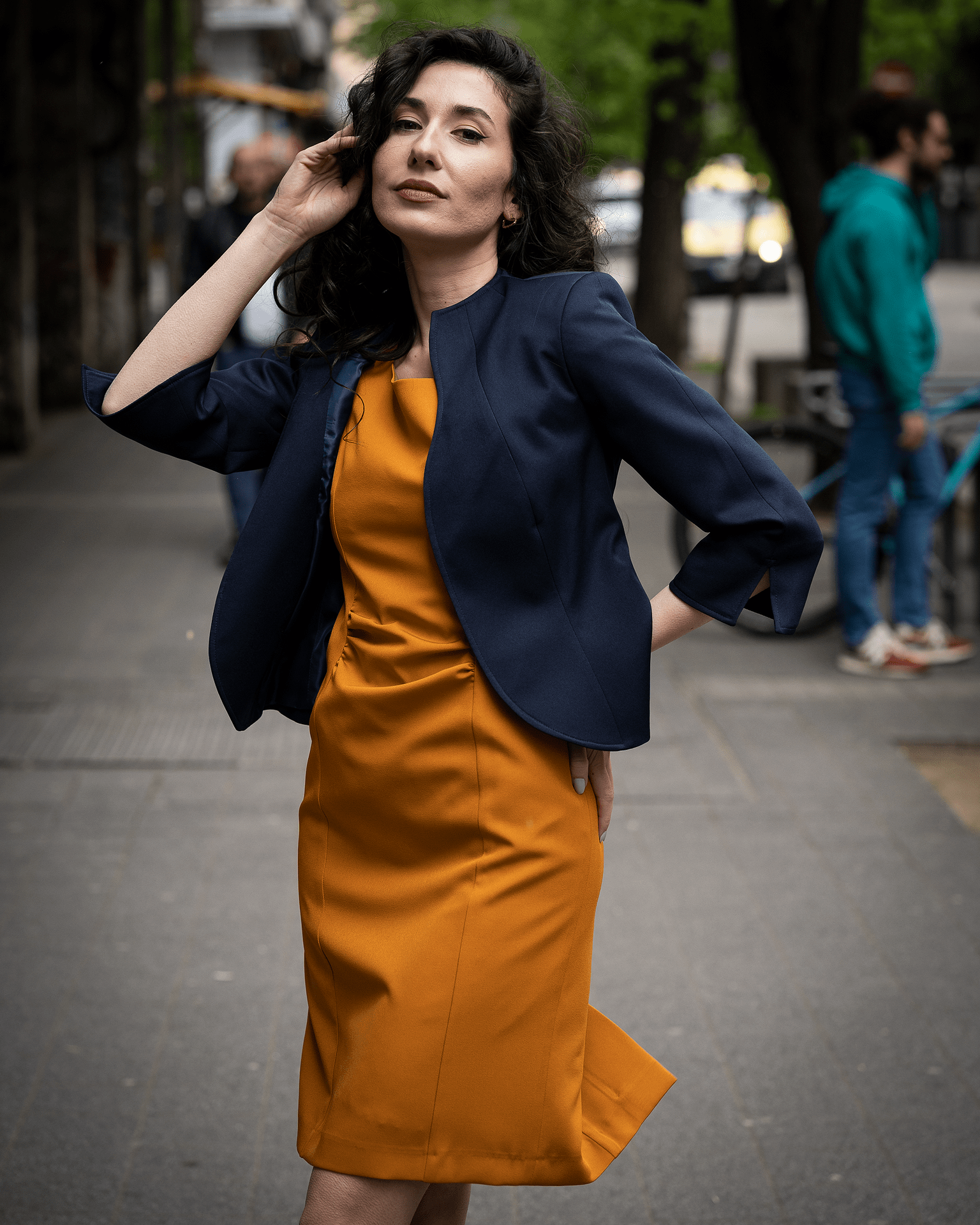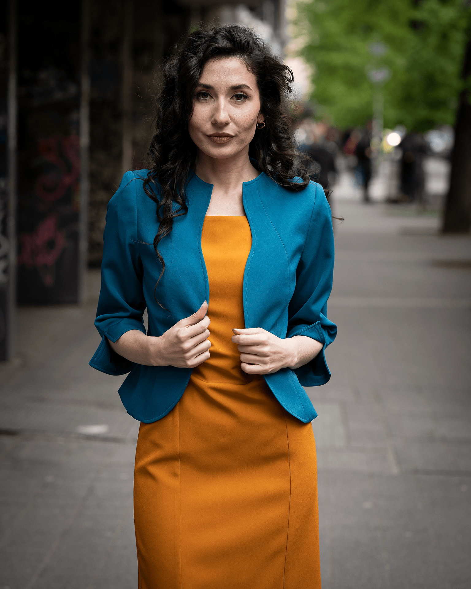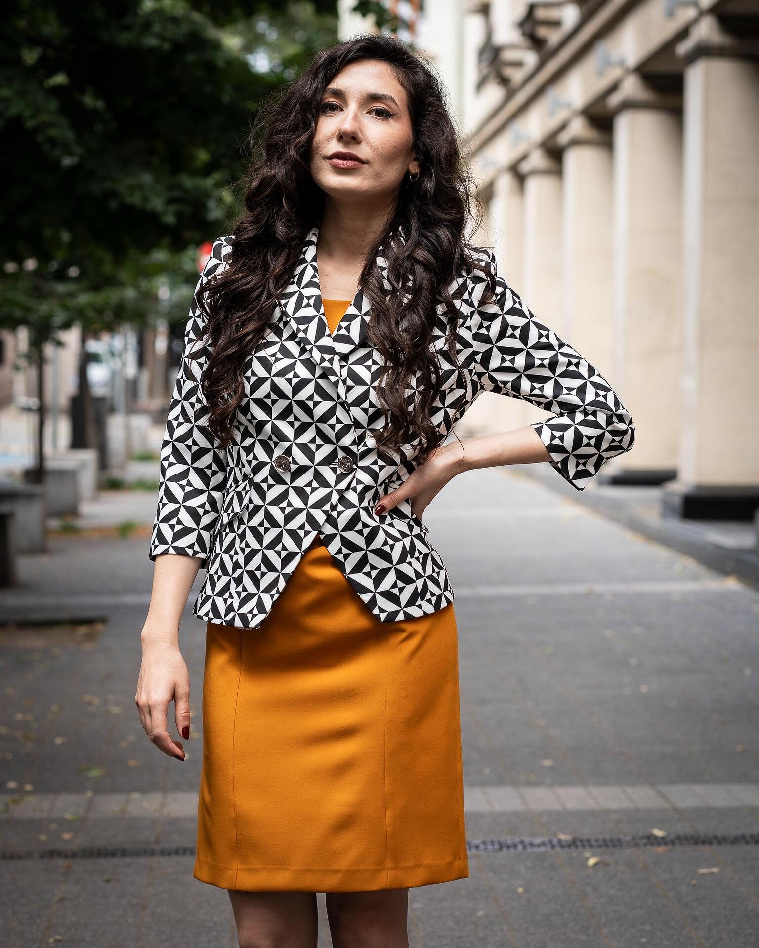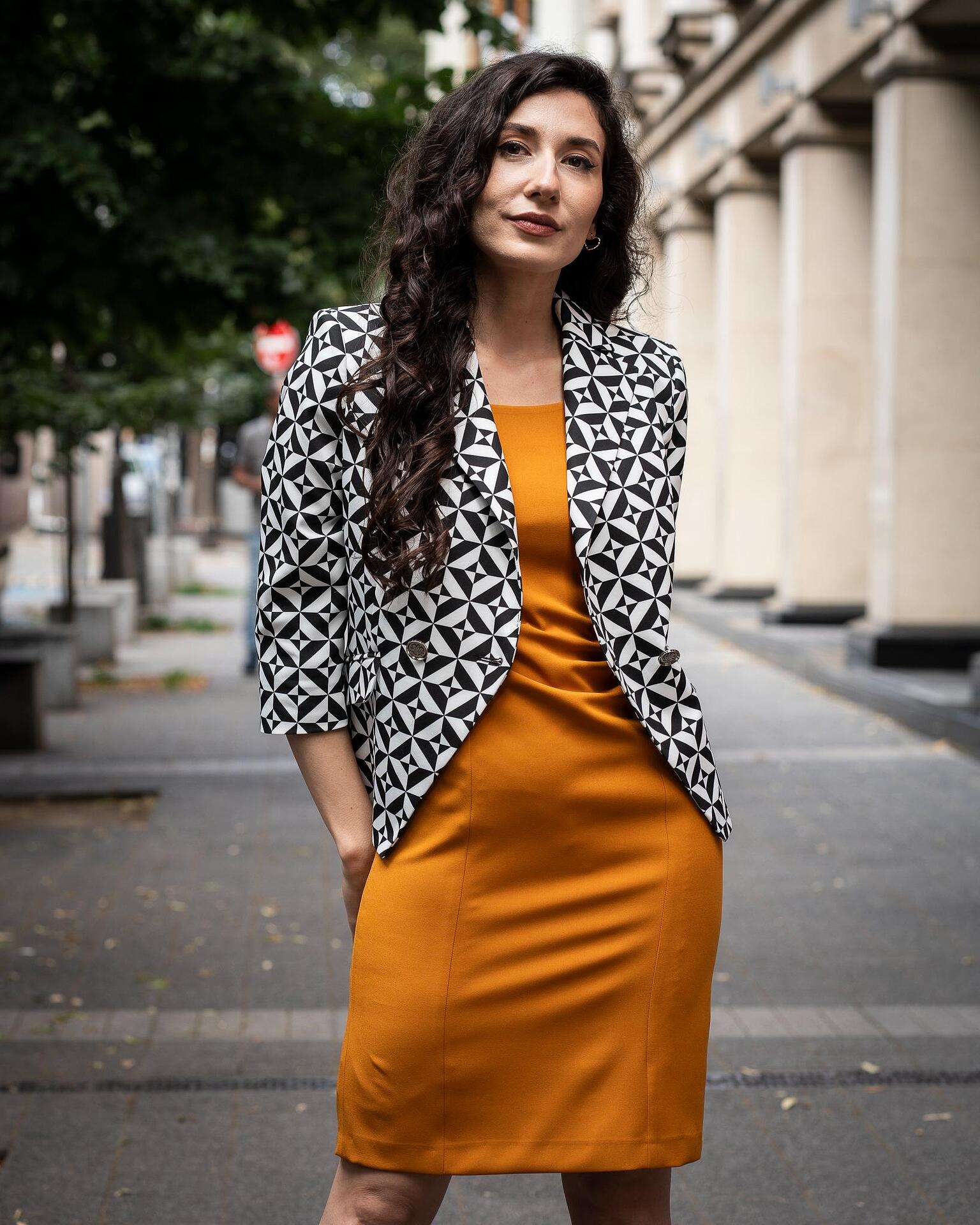 - Състав: 97% полиестер, 3% еластан; хастар: 100% полиестер.