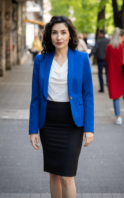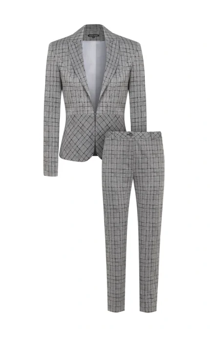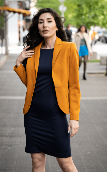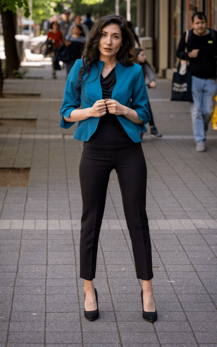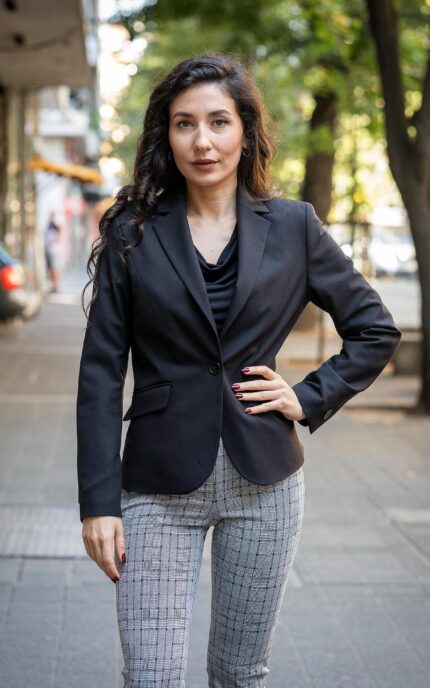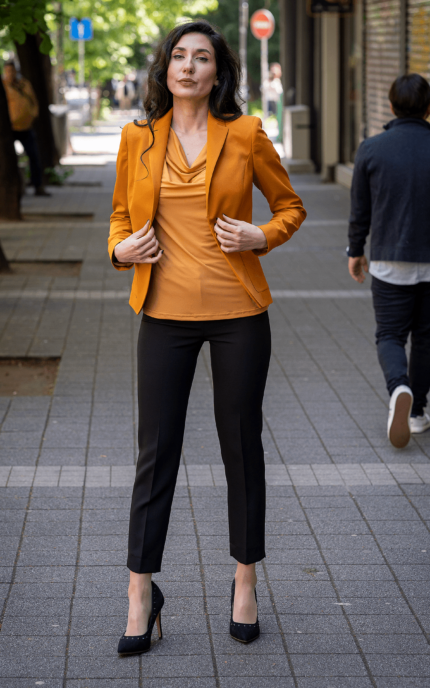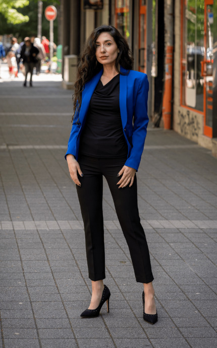 Дамски костюм от дамско сако с едно копче и тесен дамски панталон