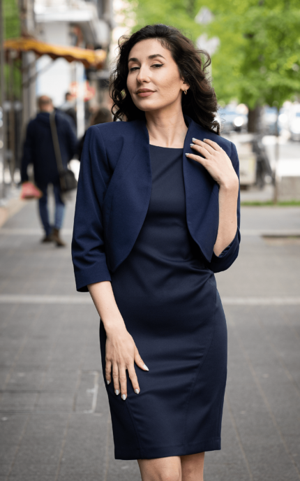 Дамски костюм от женствено късо болеро и рокля с джобове и с трапецовиден силует