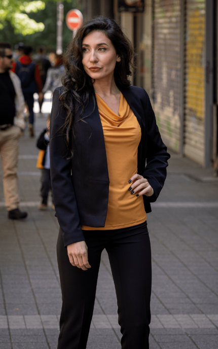 Дамски костюм от вталено сако, тесен панталон и блуза