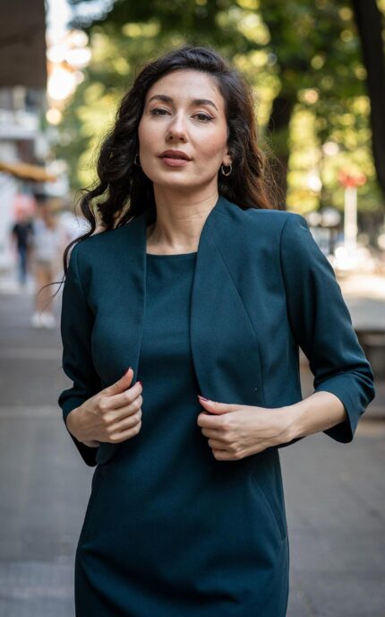161,06 € / 315,01 лв.Дамски костюм от женствено късо болеро и рокля с джобове и с трапецовиден силует