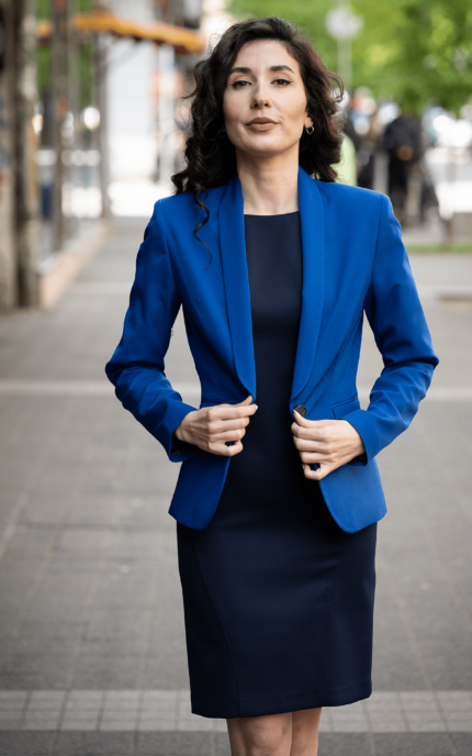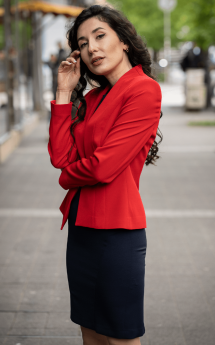 Дамски костюм от сако с едно копче и вталена женствена рокля