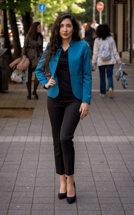 Дамски костюм от дамско сако с едно копче и тесен дамски панталон