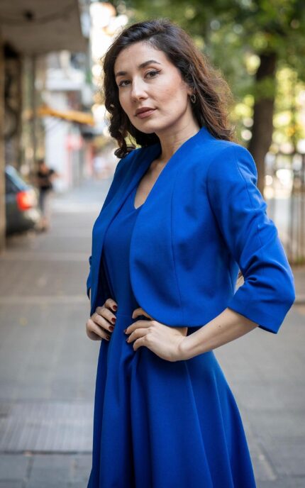 Дамски костюм от женствено късо болеро и рокля с джобове и с трапецовиден силует