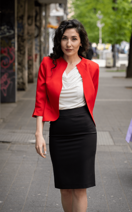 Дамски костюм от женствено късо болеро и тесен дамски панталон