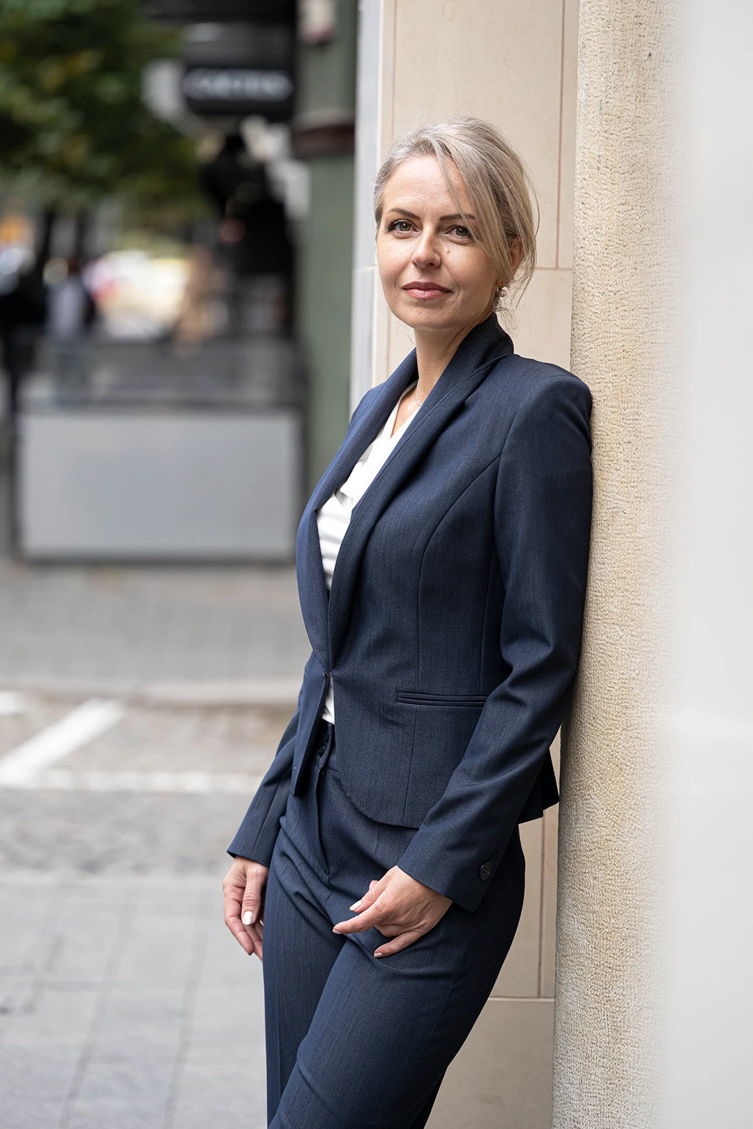 Дамски костюм от вталено сако, тесен панталон и блуза