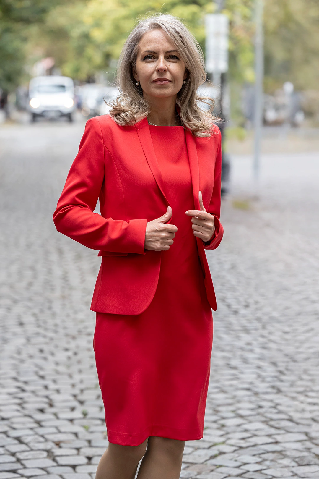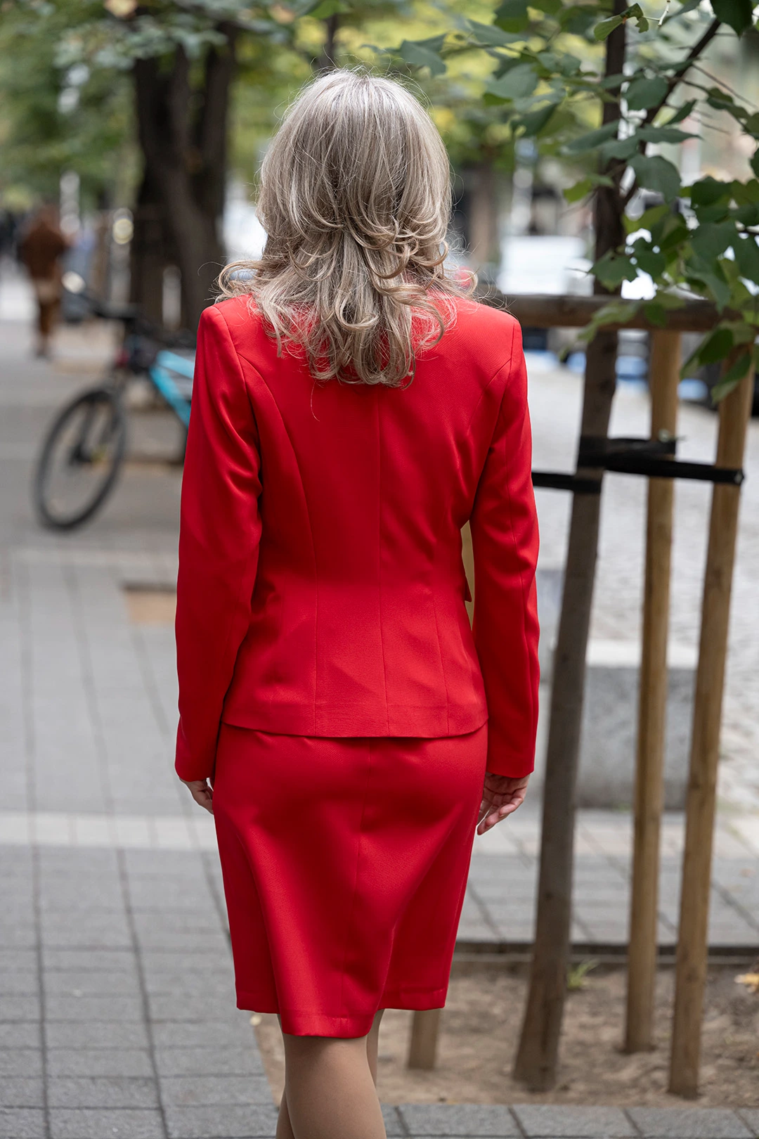 Роклята (модел 5045-11) е вталена и изящна, с чисти линии, които подчертават женствеността и увереността. Изработена от същата висококачествена материя, тя предлага комфорт, лекота и перфектно прилягане. Наситеният червен цвят придава характер и изтънченост, подходящ както за делова среда, така и за официална вечер.