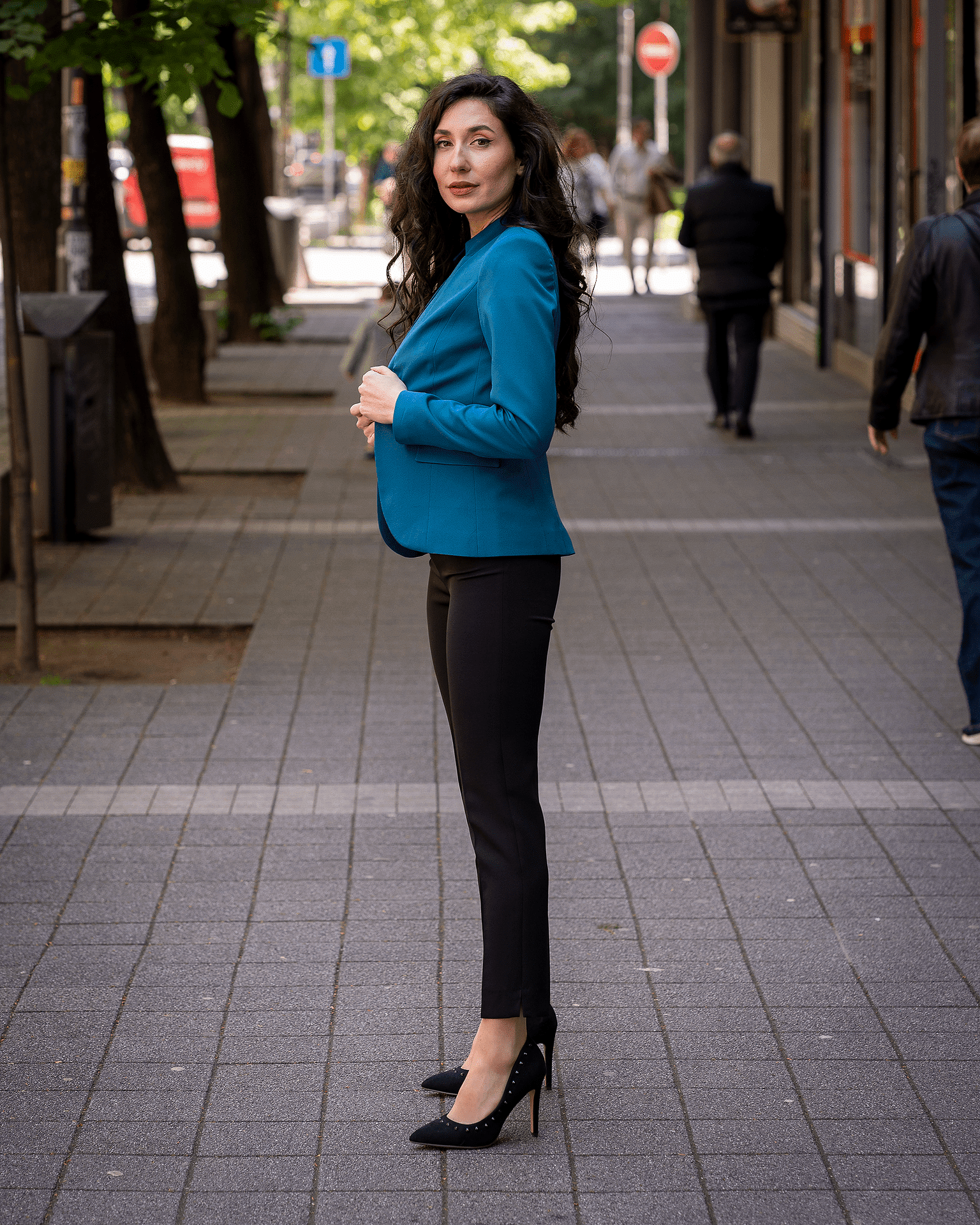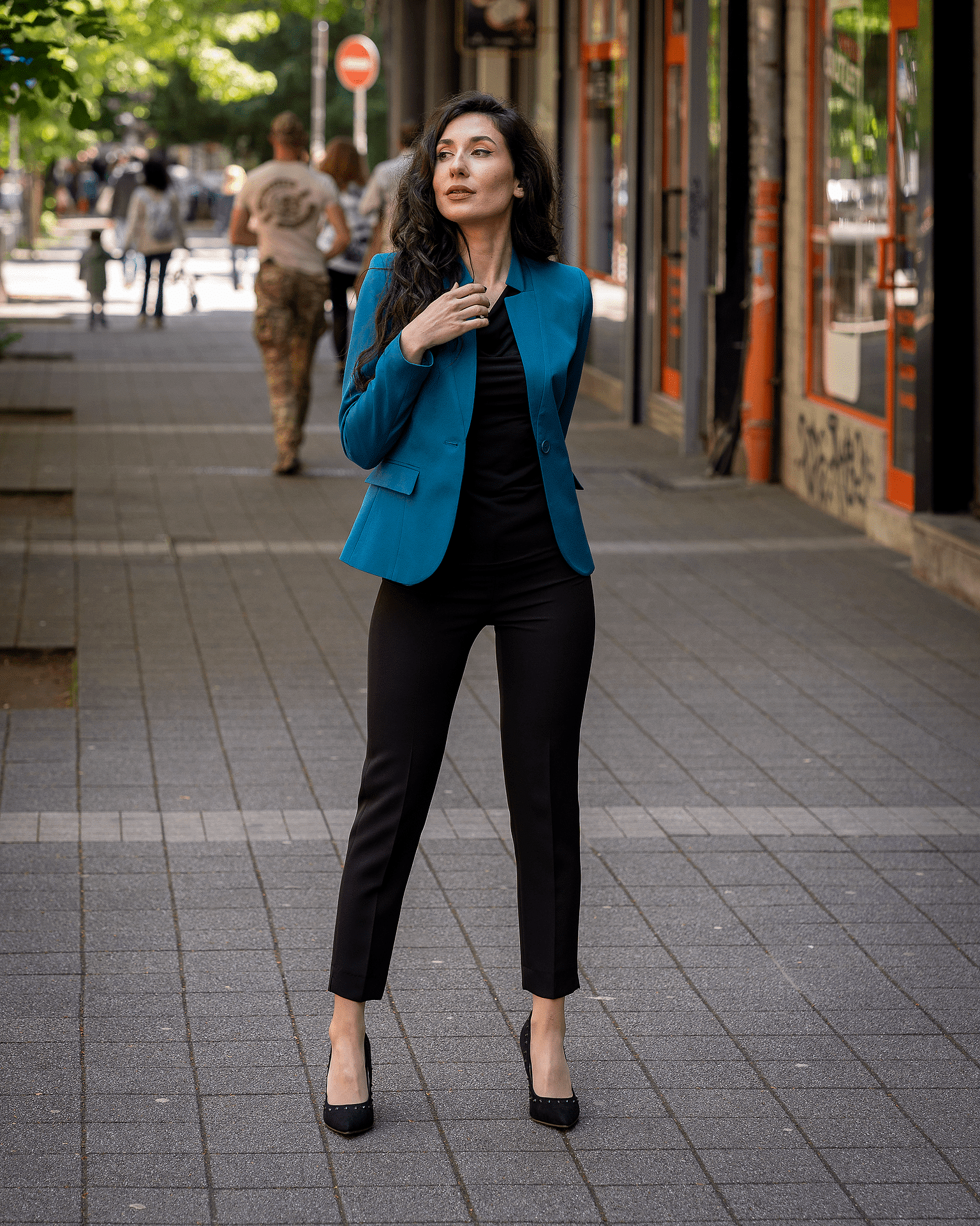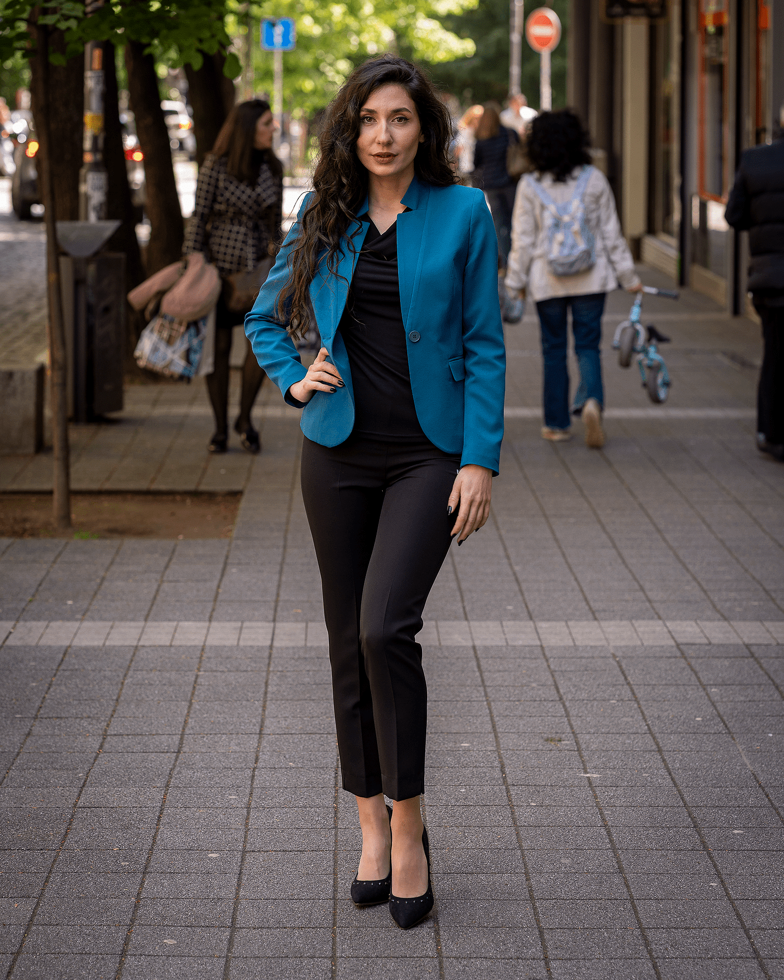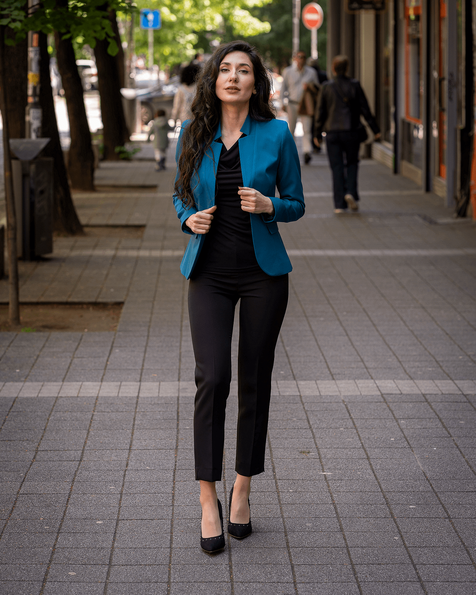 Дамски костюм от дамско сако с едно копче и тесен дамски панталон