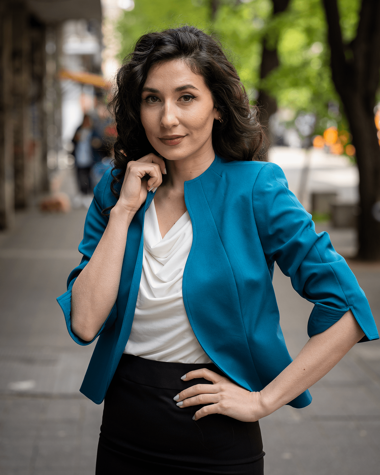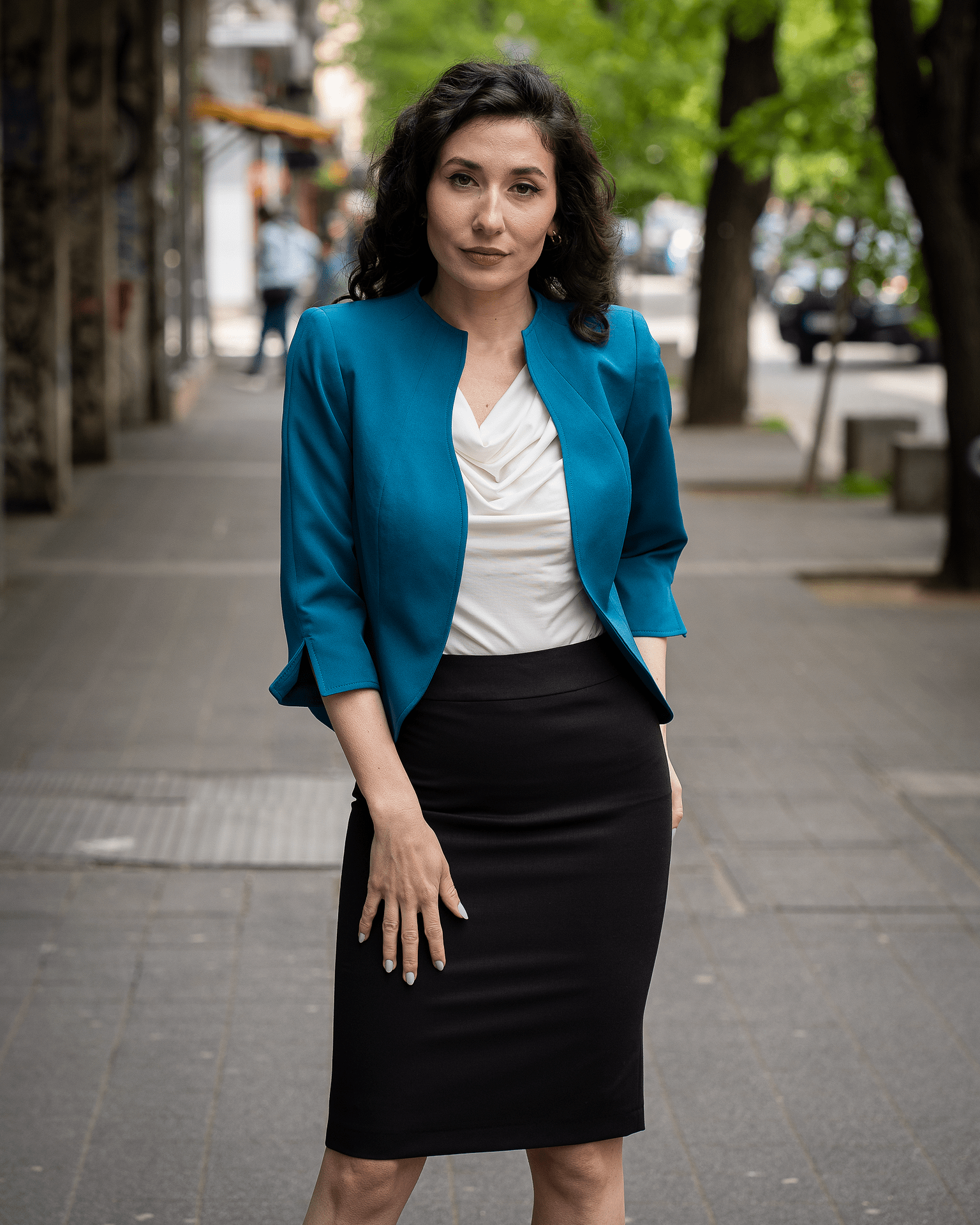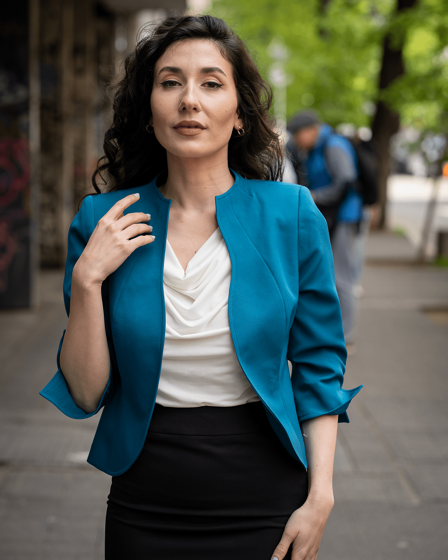 Дамски костюм от вталено сако, тесен панталон и блуза