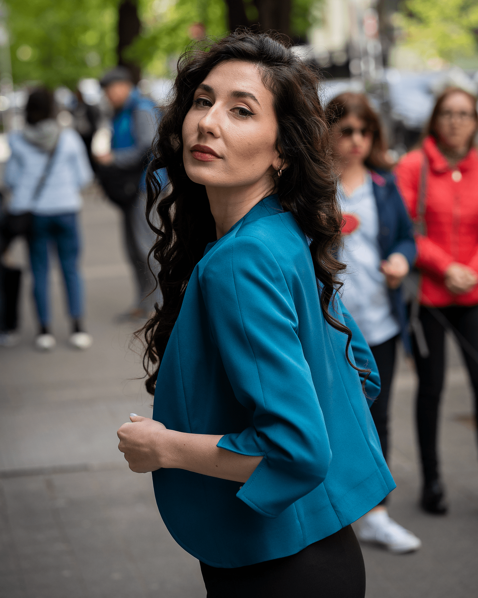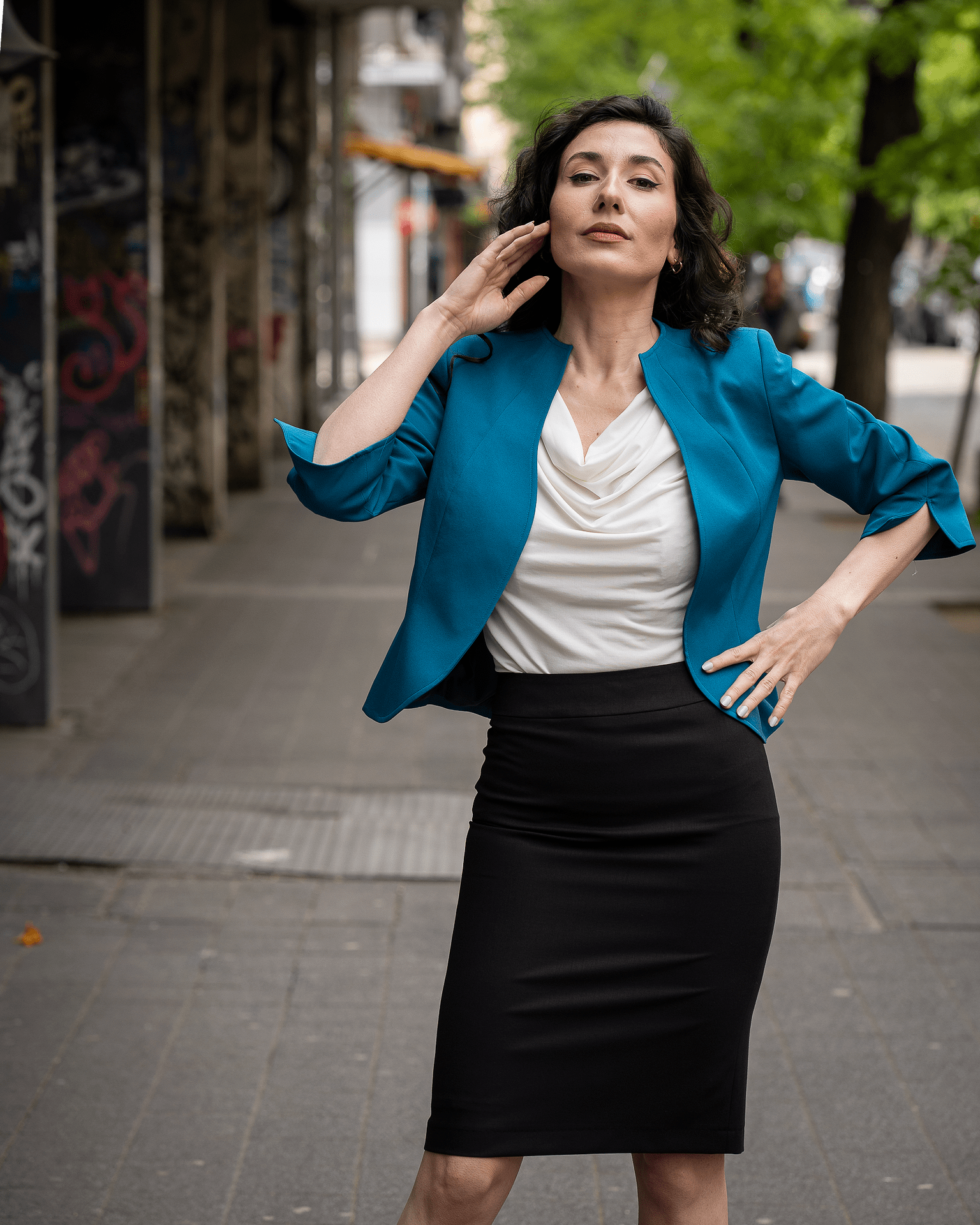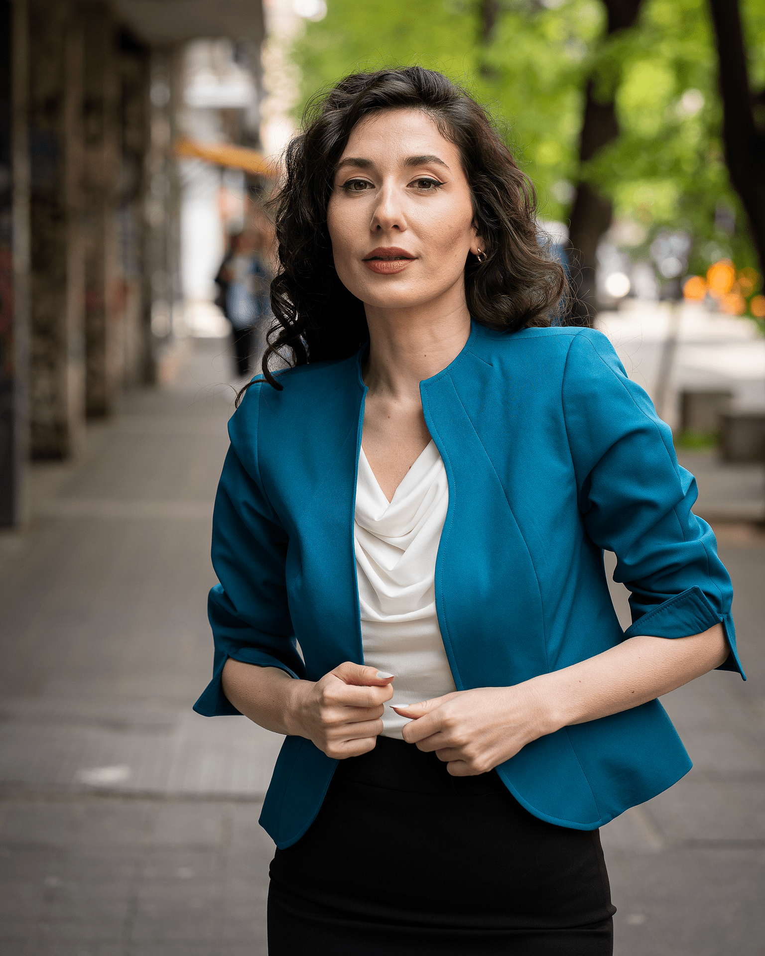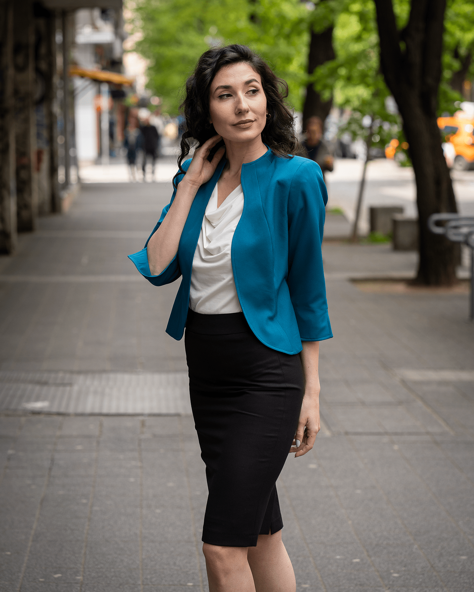 Дамски костюм от вталено сако, тесен панталон и блуза