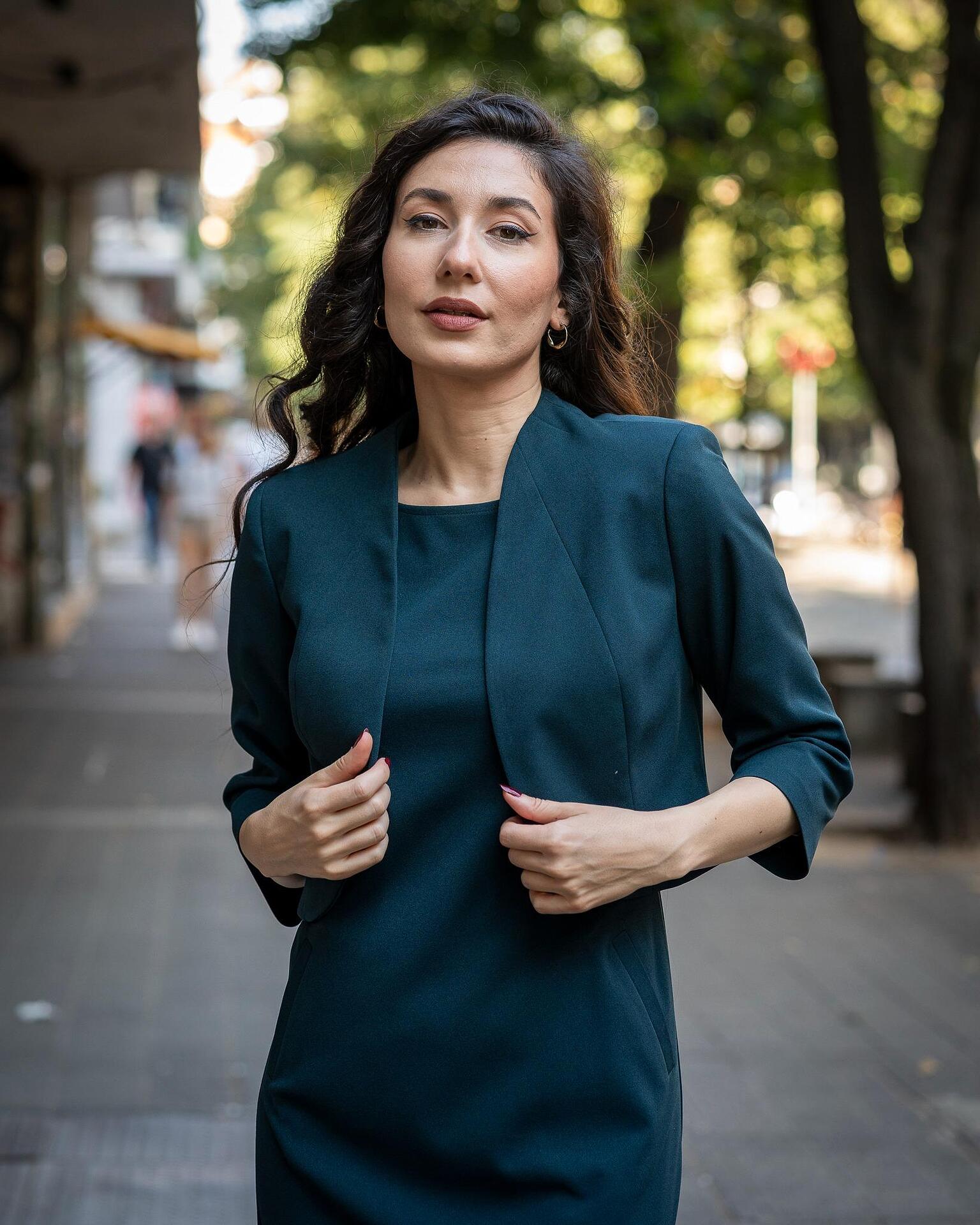 Дамски костюм от сако с едно копче и вталена женствена рокля