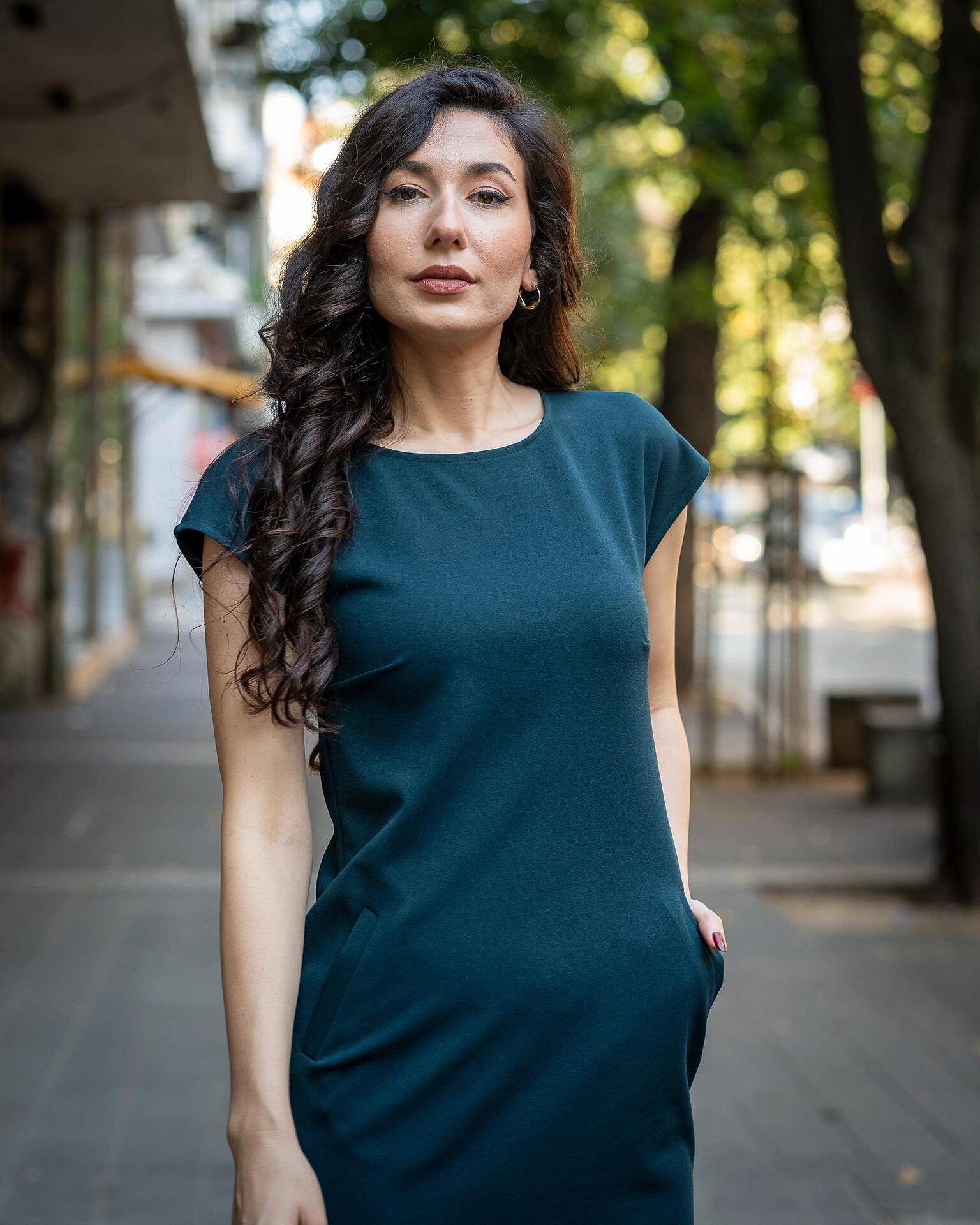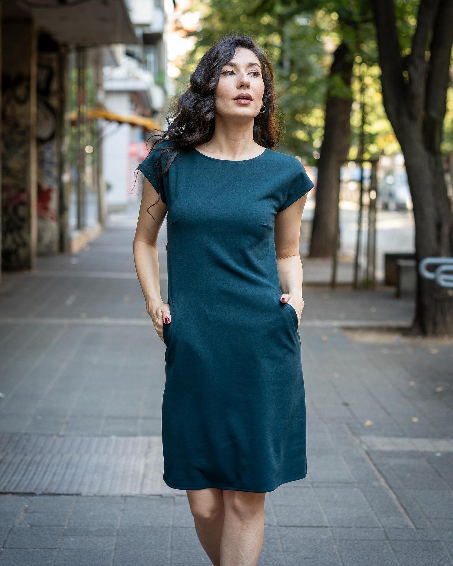 Дамски костюм от женствено късо болеро и рокля с джобове и с трапецовиден силует