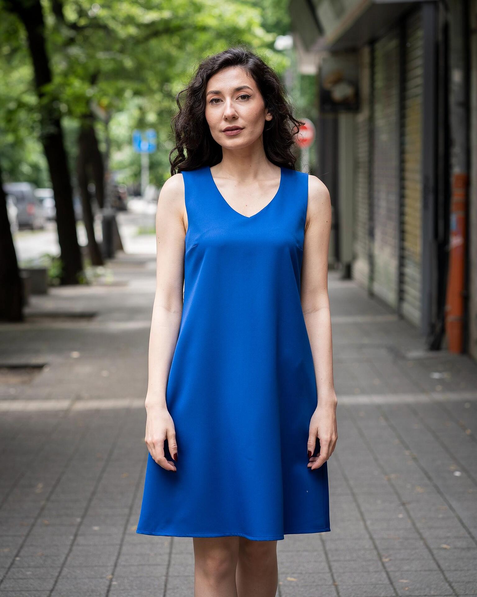 - Дамски костюм от сако с остър ревер и рокля с V-образно деколте