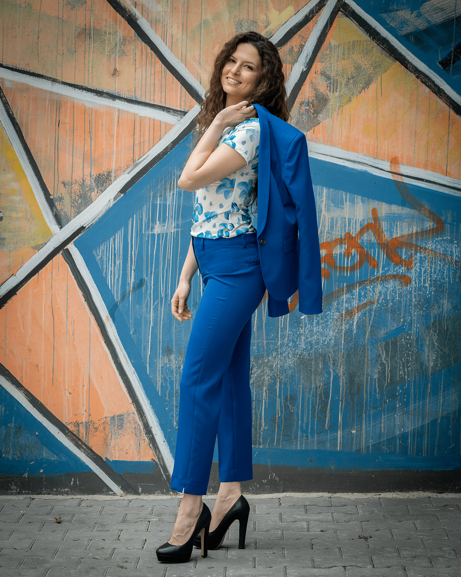 Дамски костюм от дамско сако с едно копче и тесен дамски панталон