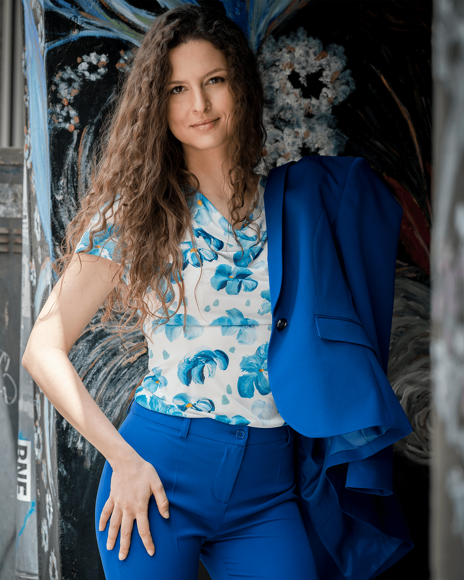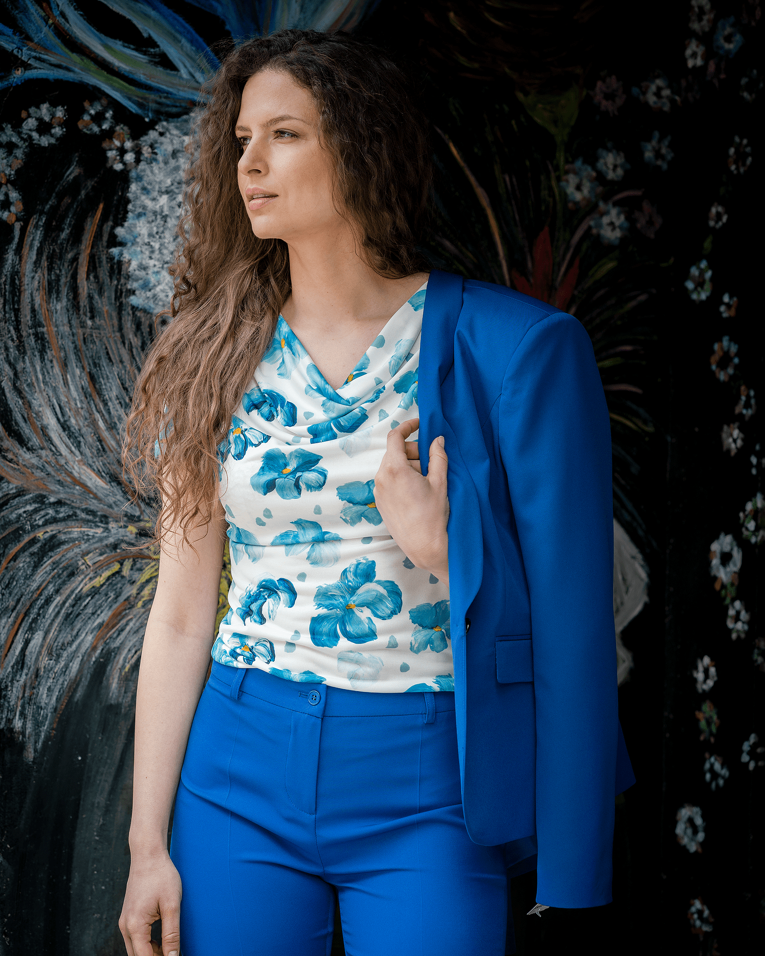Дамски костюм от вталено сако, тесен панталон и блуза