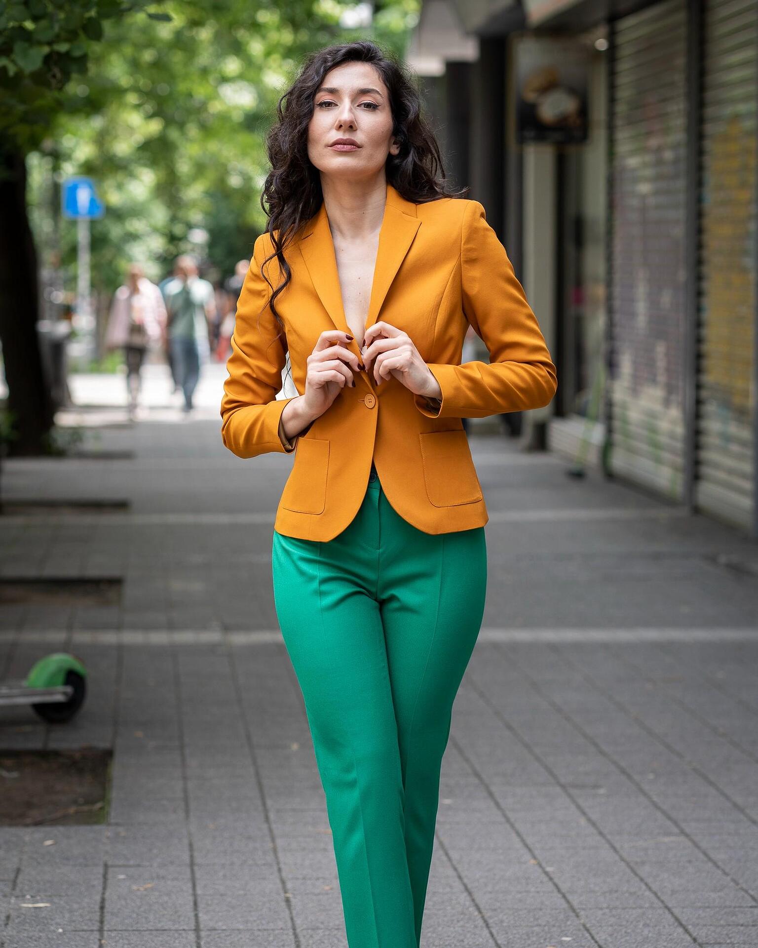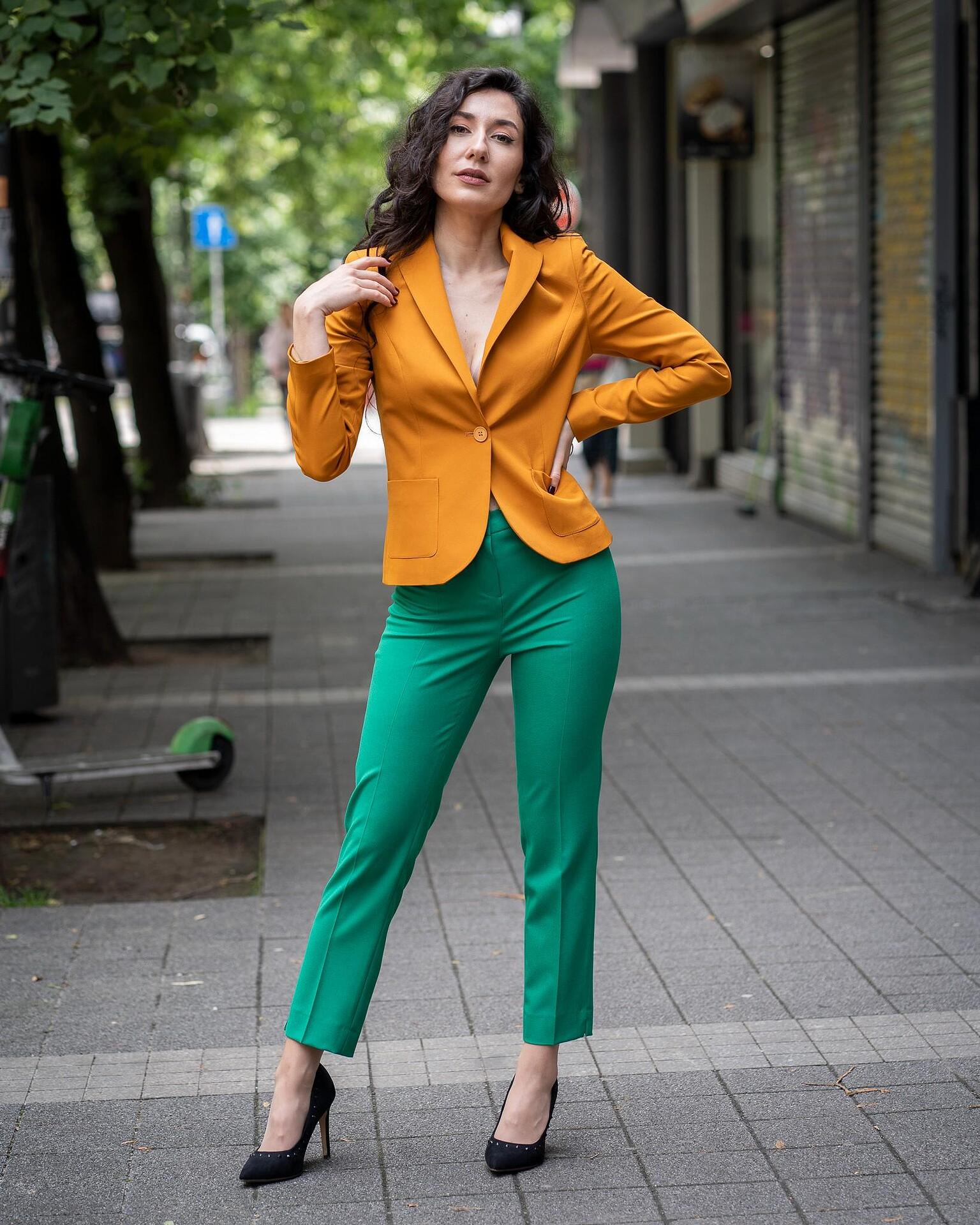 Дамски костюм от дамско сако с едно копче и тесен дамски панталон