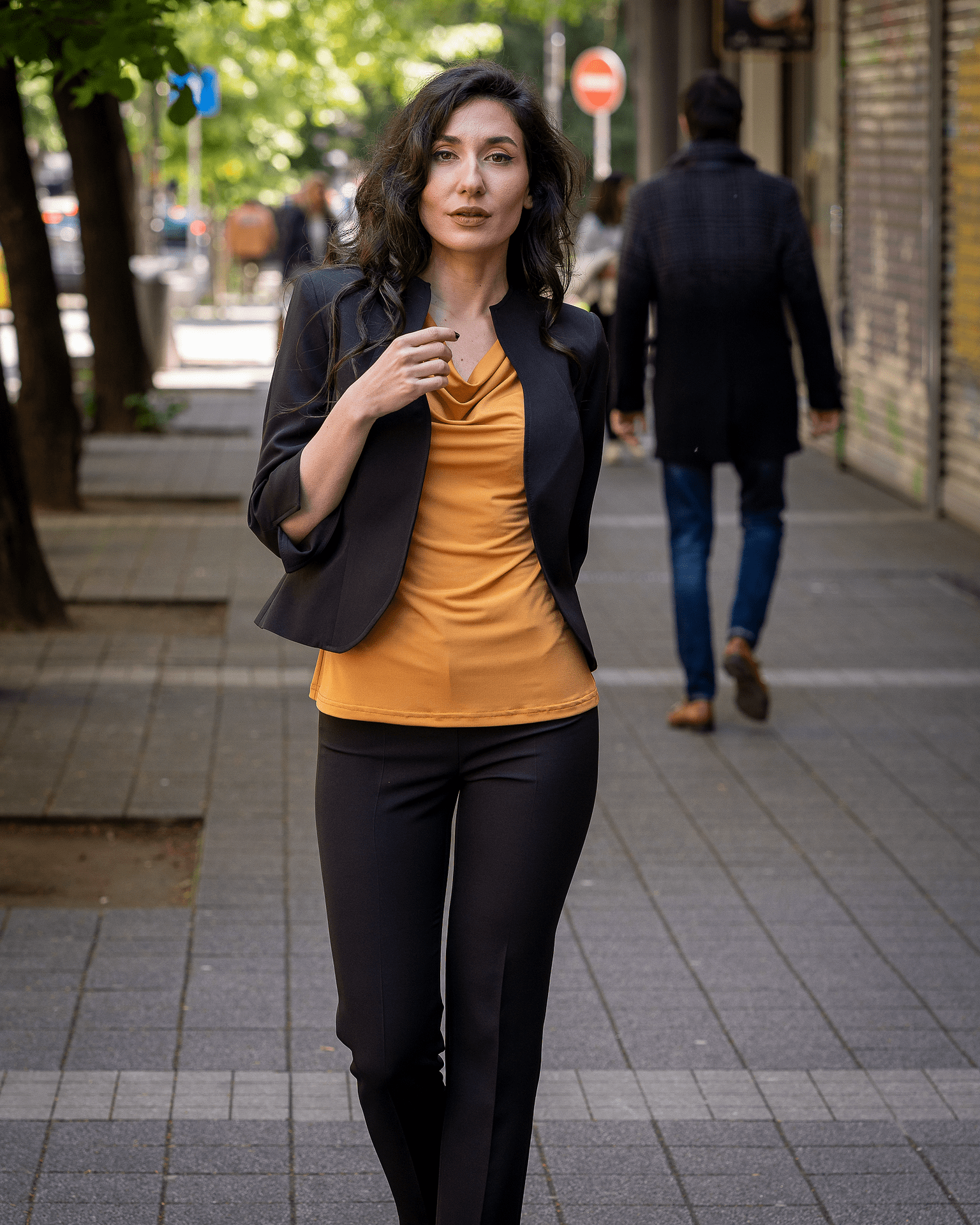 Дамски костюм от вталено сако, тесен панталон и блуза