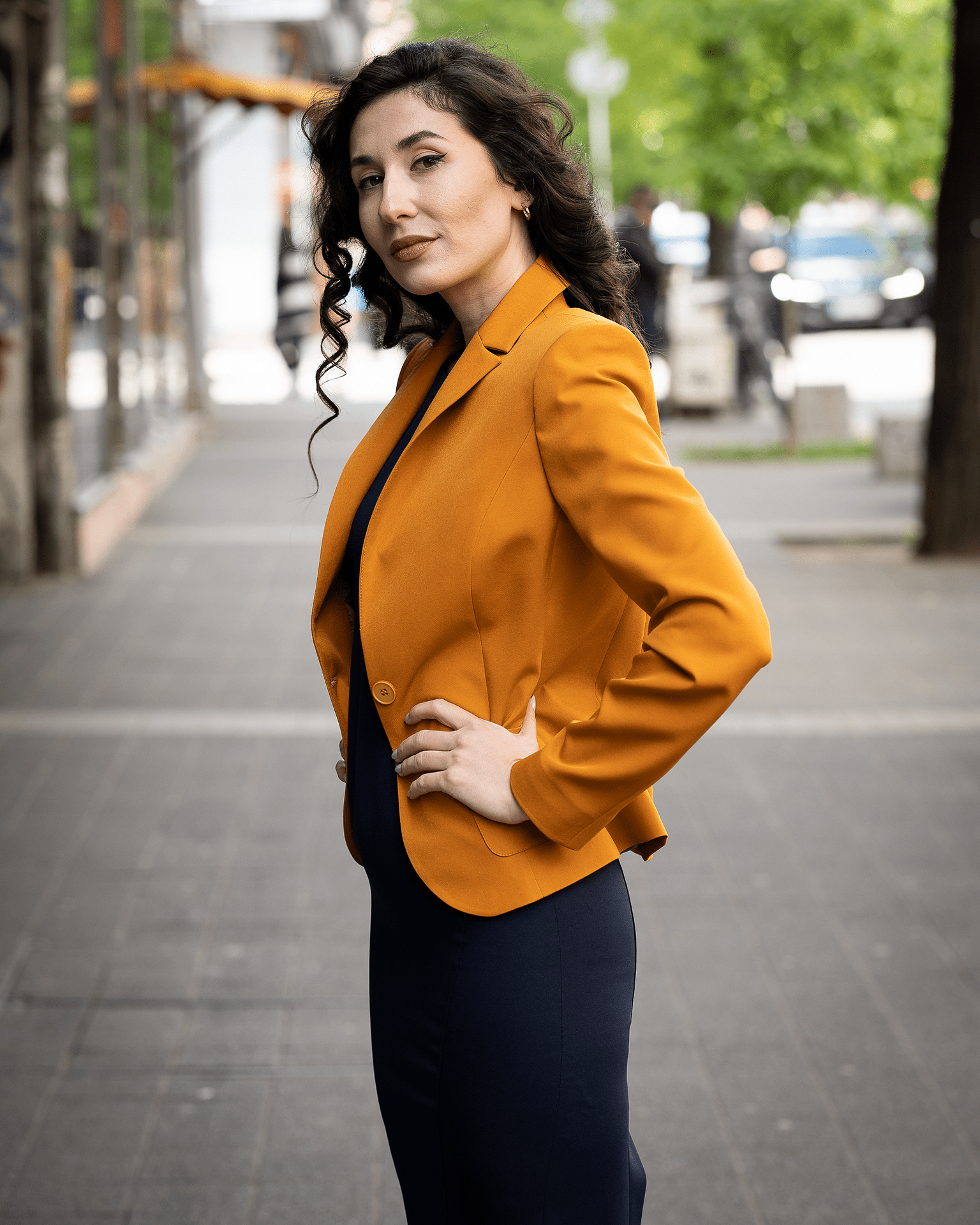 Дамски костюм от дамско сако с едно копче и тесен дамски панталон