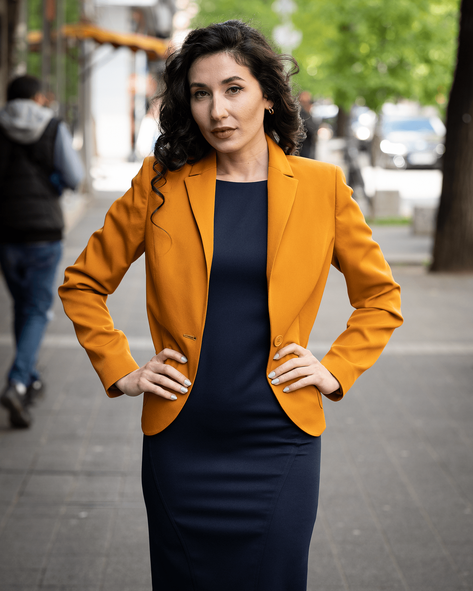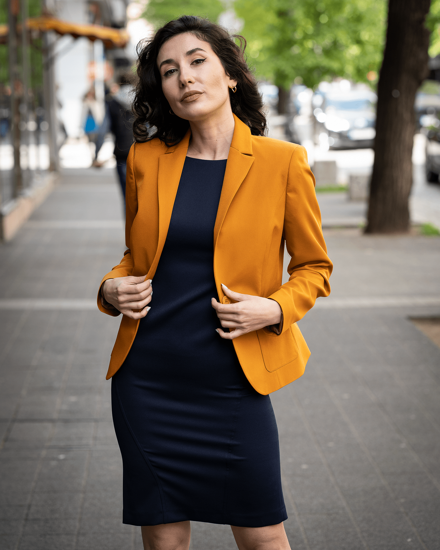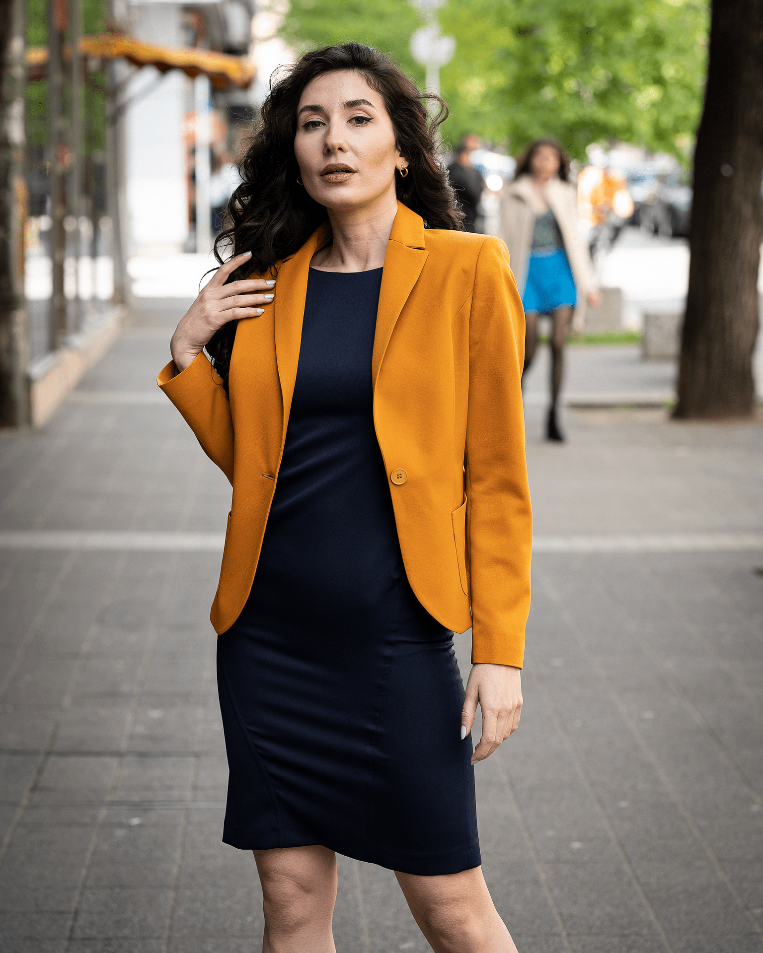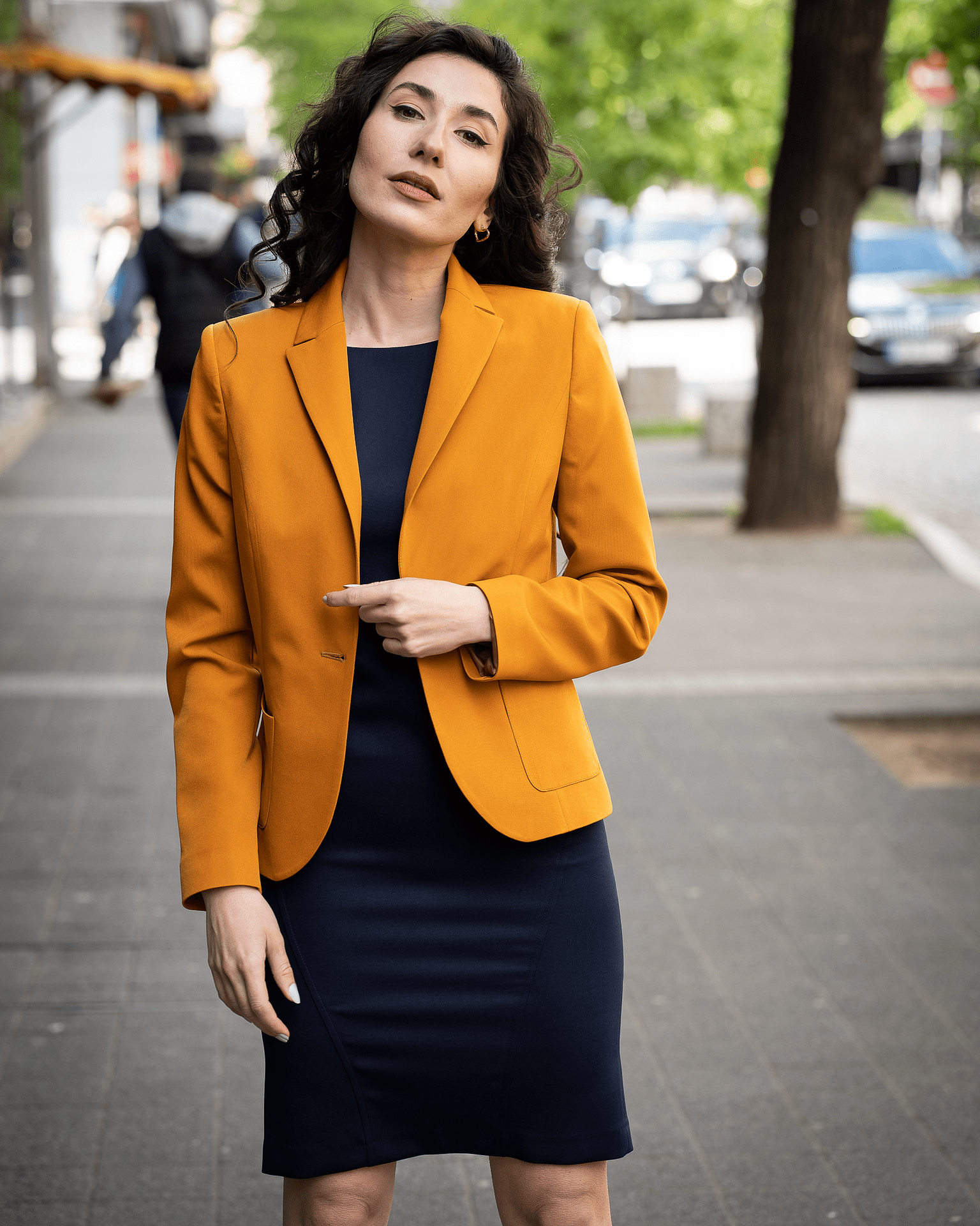 Дамски костюм от сако с едно копче и вталена женствена рокля
