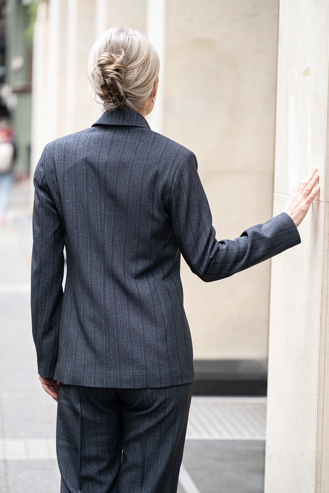 Комбинирани заедно, сакото и панталонът създават висококласен дамски костюм, който излъчва сила, увереност и стил — перфектен избор за деловата жена с усет към детайла.