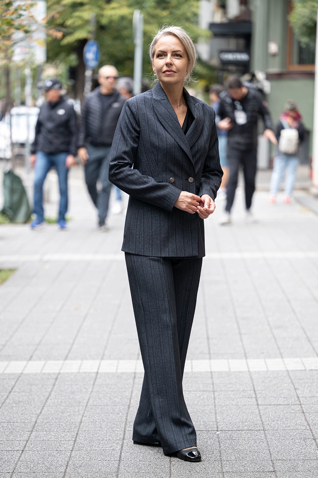 Изискан и уверено женствен, дамският костюм в десен райе от Aleta Parizi комбинира двуредно сако с метализирани копчета и широк панталон с висока талия – съвременна интерпретация на класическата бизнес визия. Създаден за жени, които ценят елегантността, детайла и свободата на движение, този комплект е подходящ както за офис и корпоративна среда, така и за официални поводи.