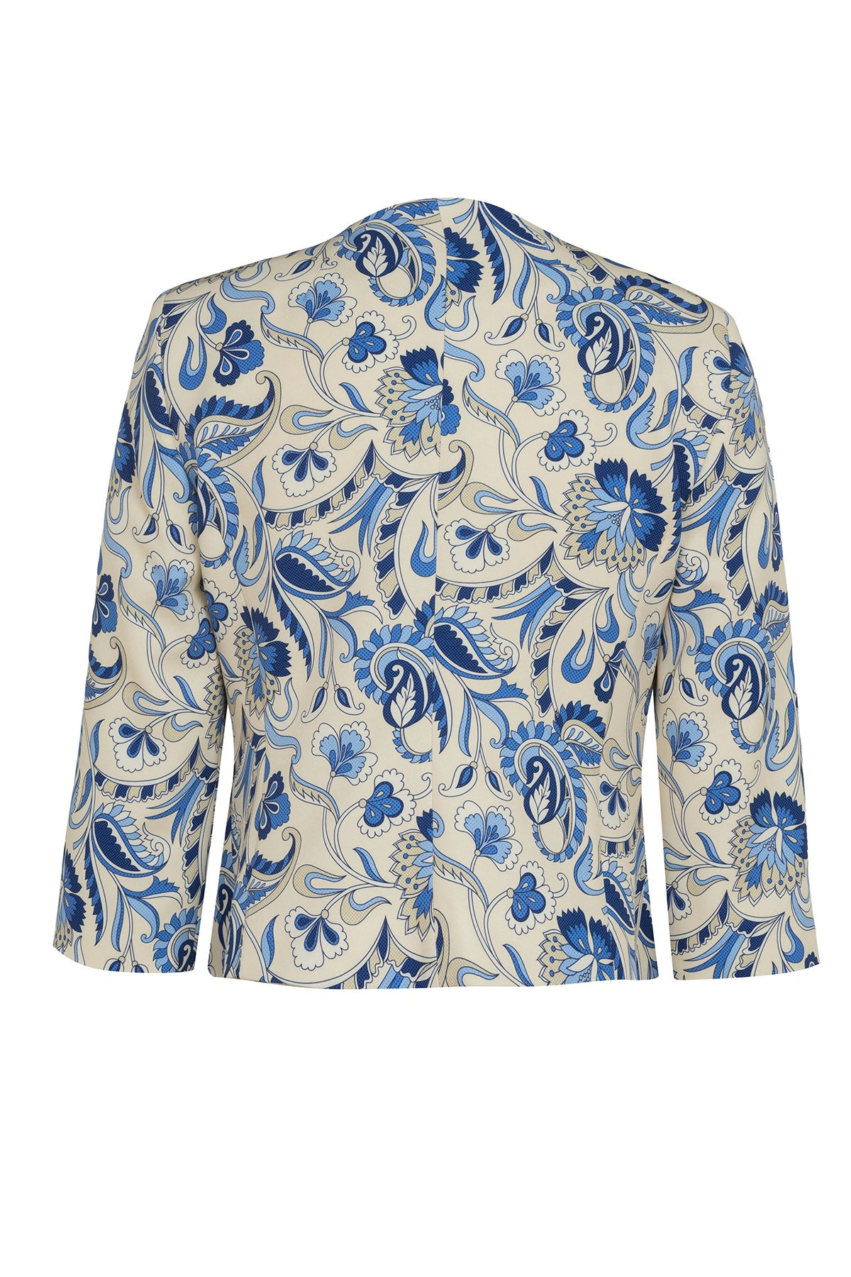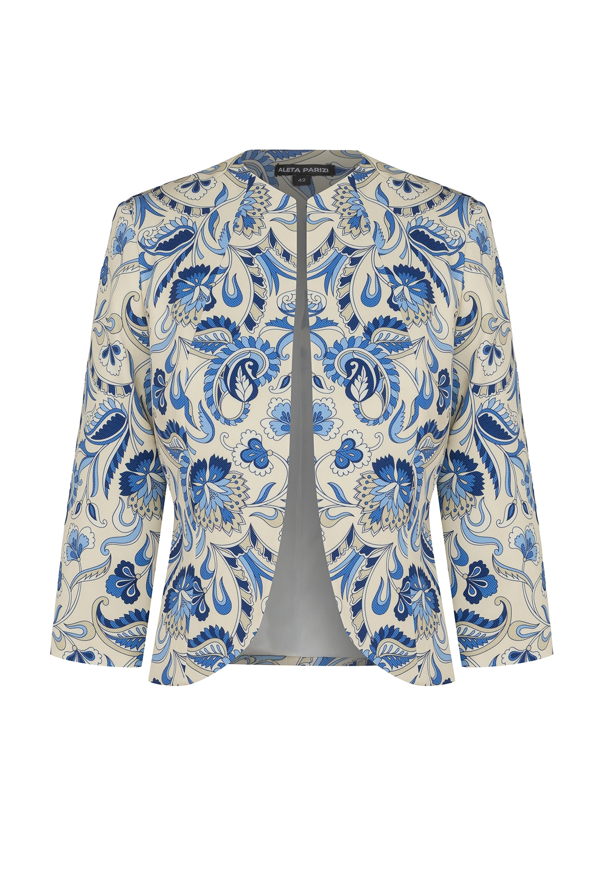 Модел 131-5 от Aleta Parizi е късото болеро, което превръща всяка визия в изявление. Богатият флорален пейсли принт в топло бежово и наситено кобалтово синьо носи артистичност и характер, а чистата кройка без ревери и без закопчаване осигурява лекота и елегантност.
