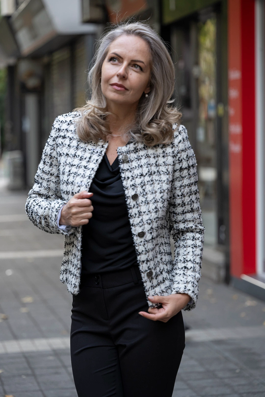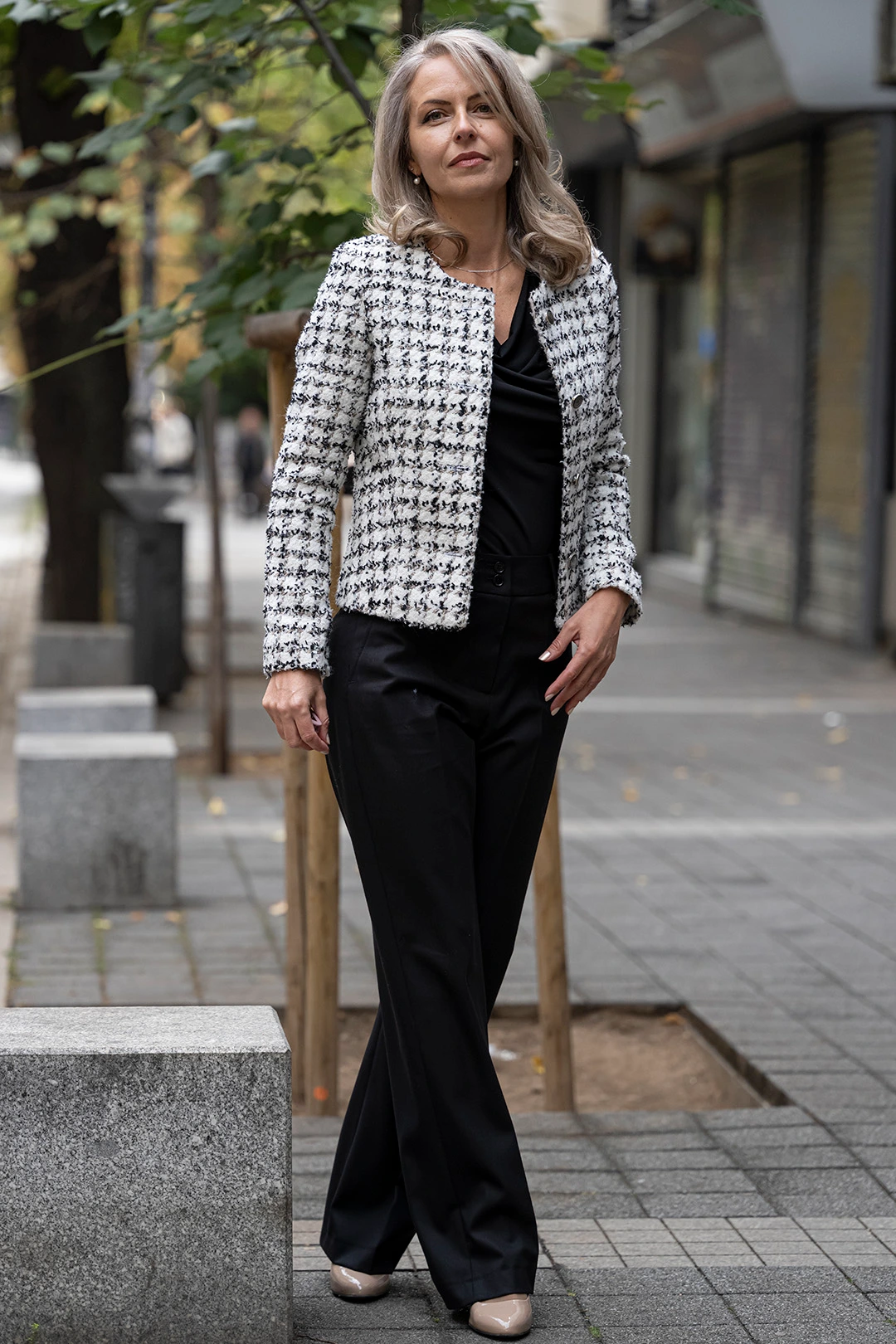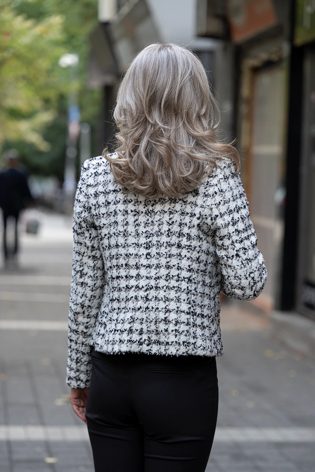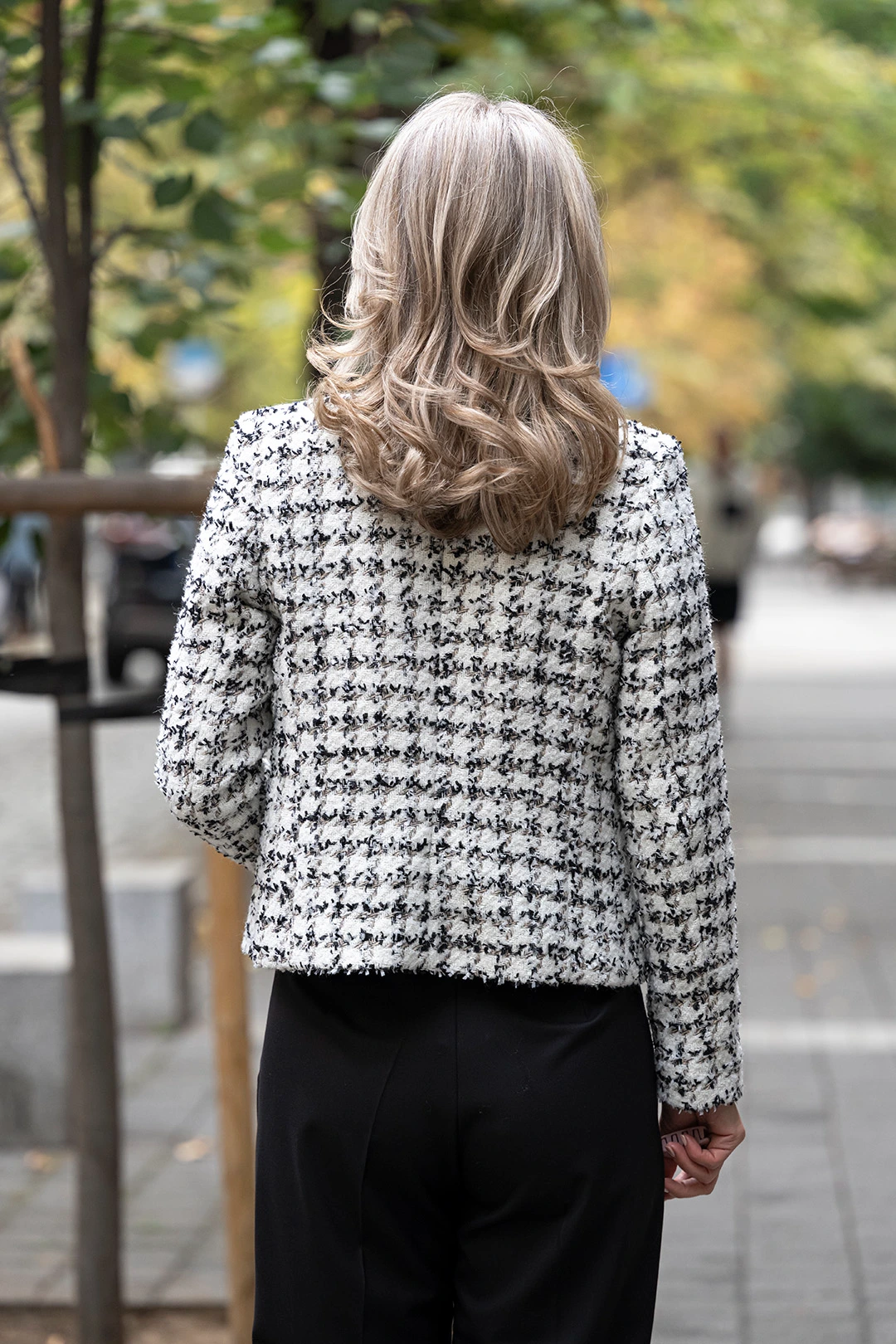Късото дамско сако от плат букле каре на Aleta Parizi е създадено за модерната жена, която обича класиката с изискано излъчване. Сакото комбинира елегантна кройка и висококачествена изработка, което го прави перфектен избор както за офис и бизнес срещи, така и за ежедневни визии с характер.
