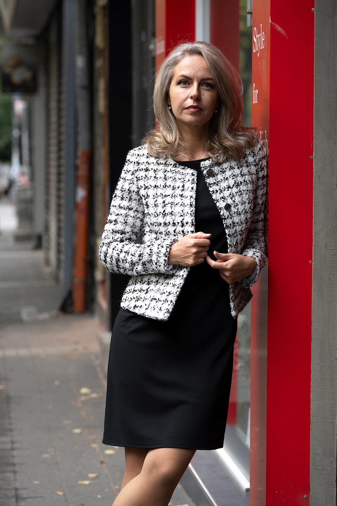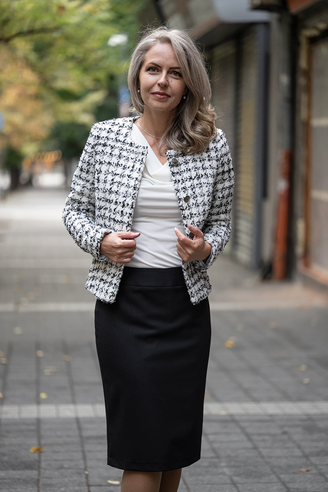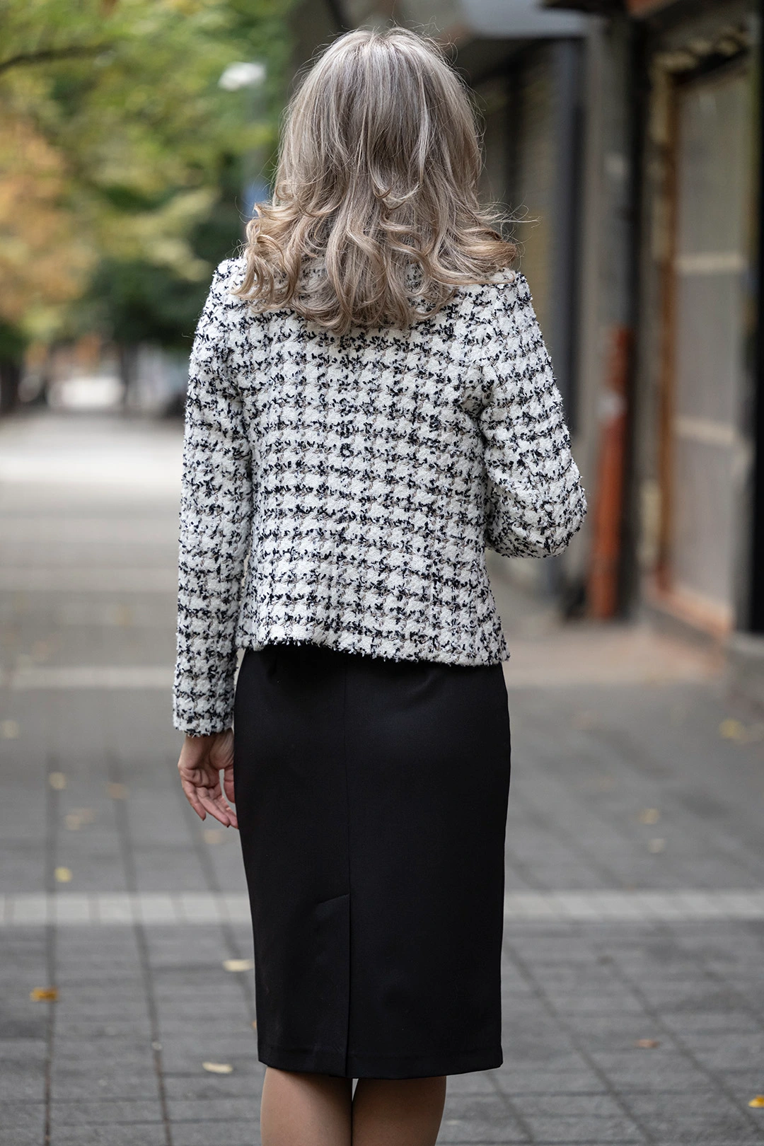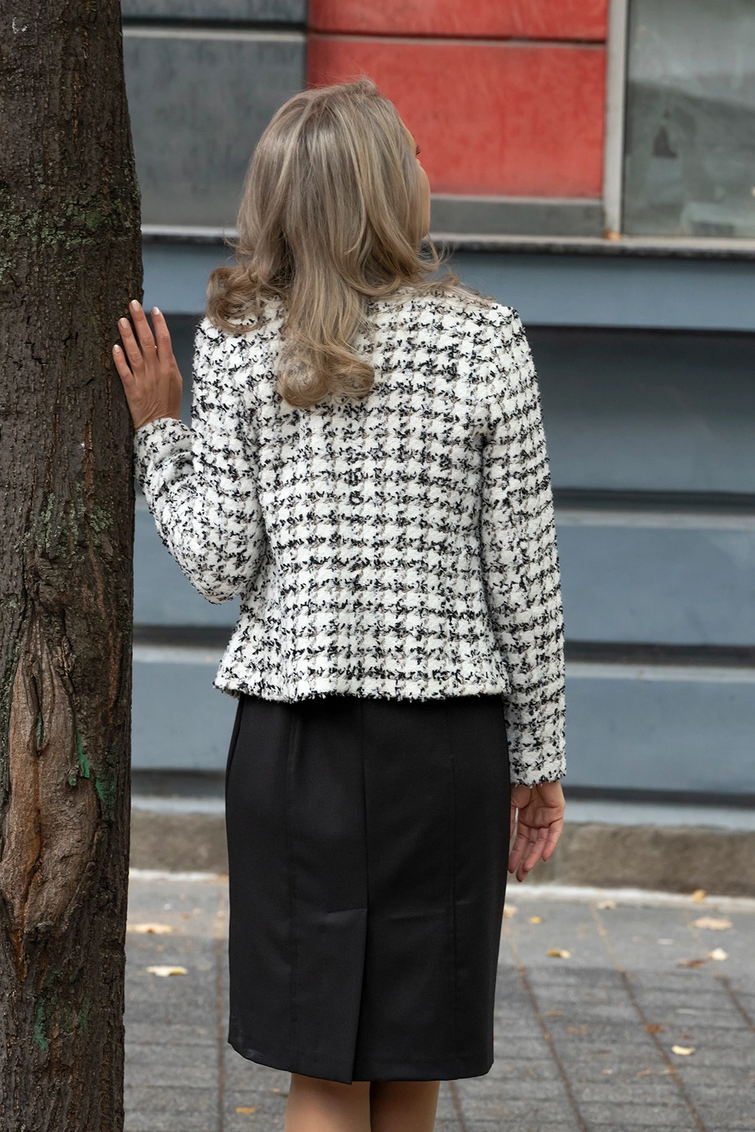 Късото дамско сако от плат букле каре на Aleta Parizi е създадено за модерната жена, която обича класиката с изискано излъчване. Сакото комбинира елегантна кройка и висококачествена изработка, което го прави перфектен избор както за офис и бизнес срещи, така и за ежедневни визии с характер.