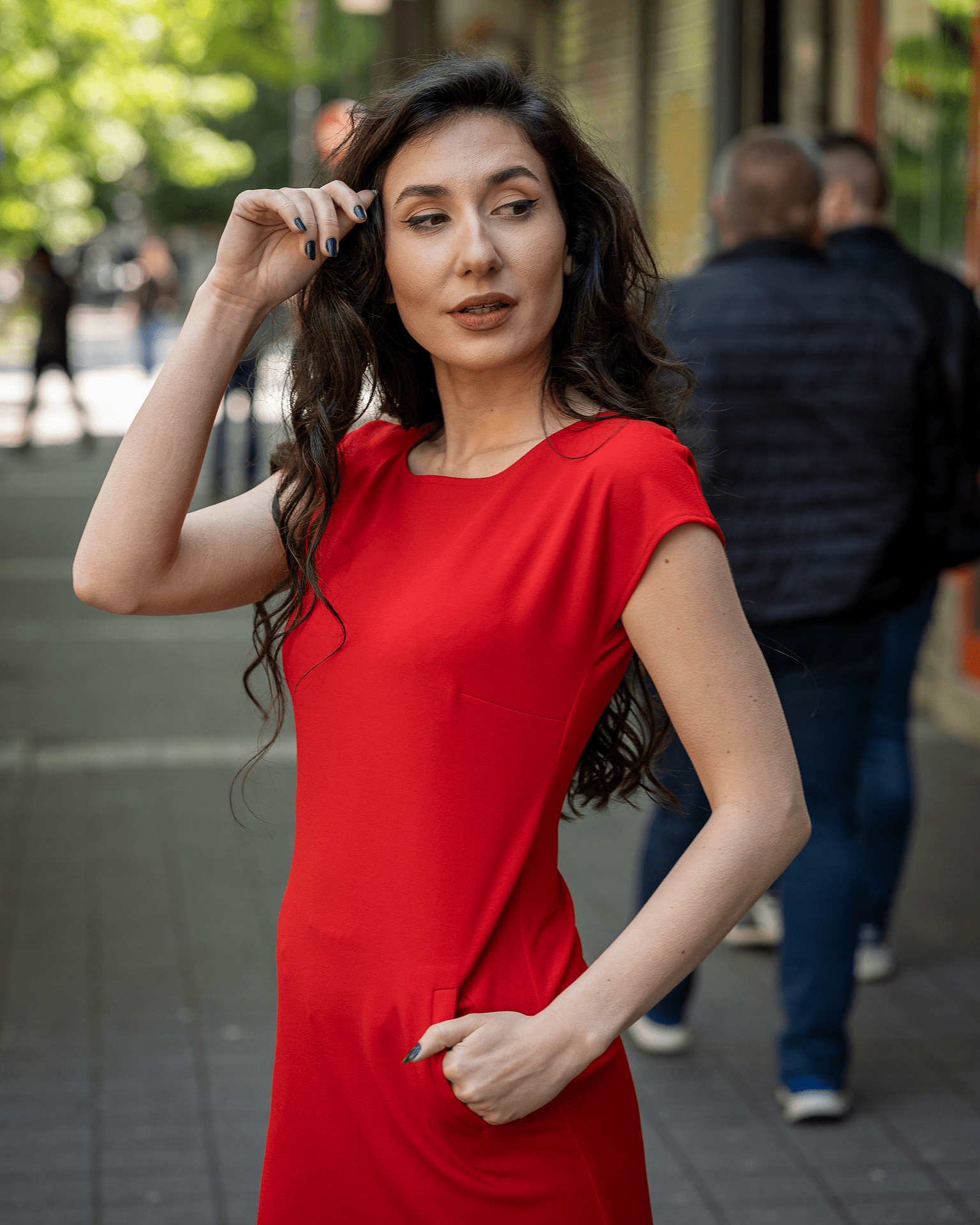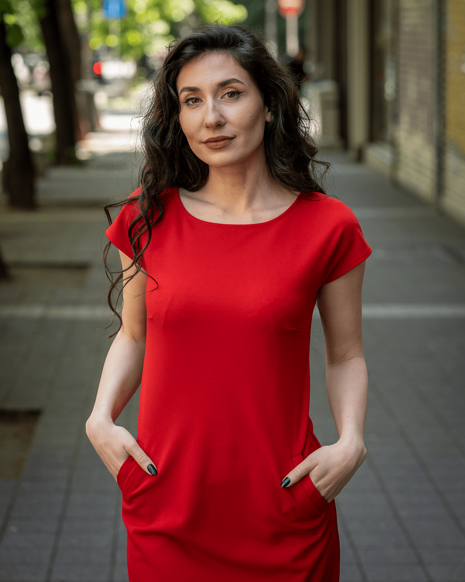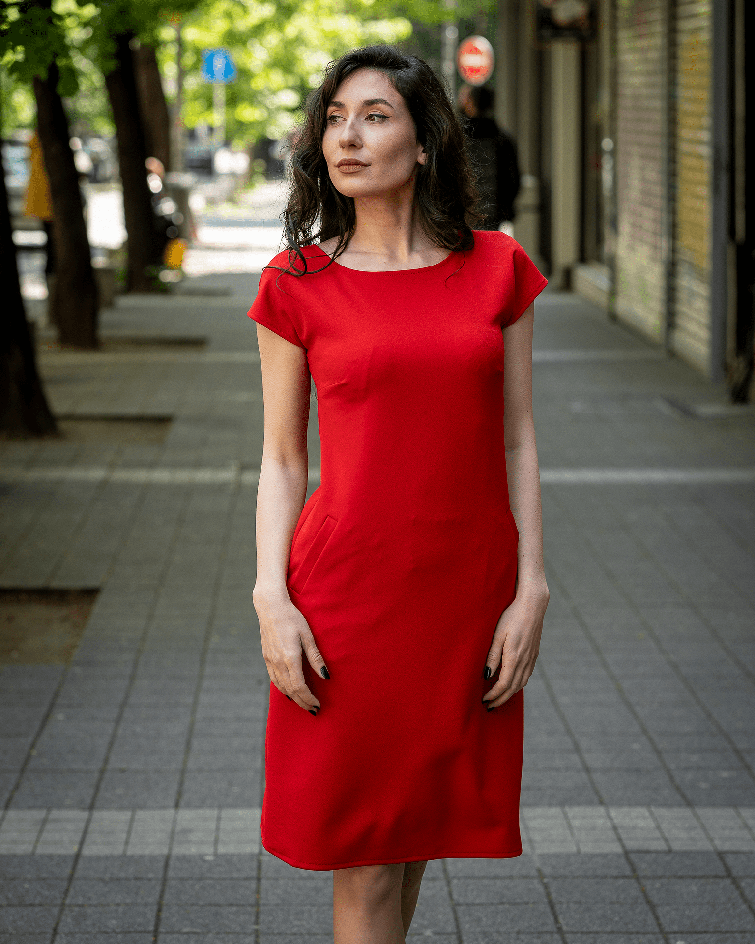 Комбинация от късо палто с декоративен колан на гърба и рокля с джобове и трапецовиден силует