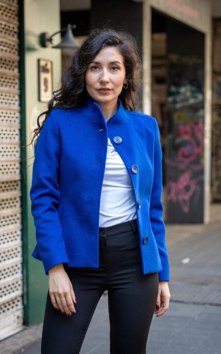 Комбинация от късо палто с декоративен колан на гърба и тесен дамски панталон