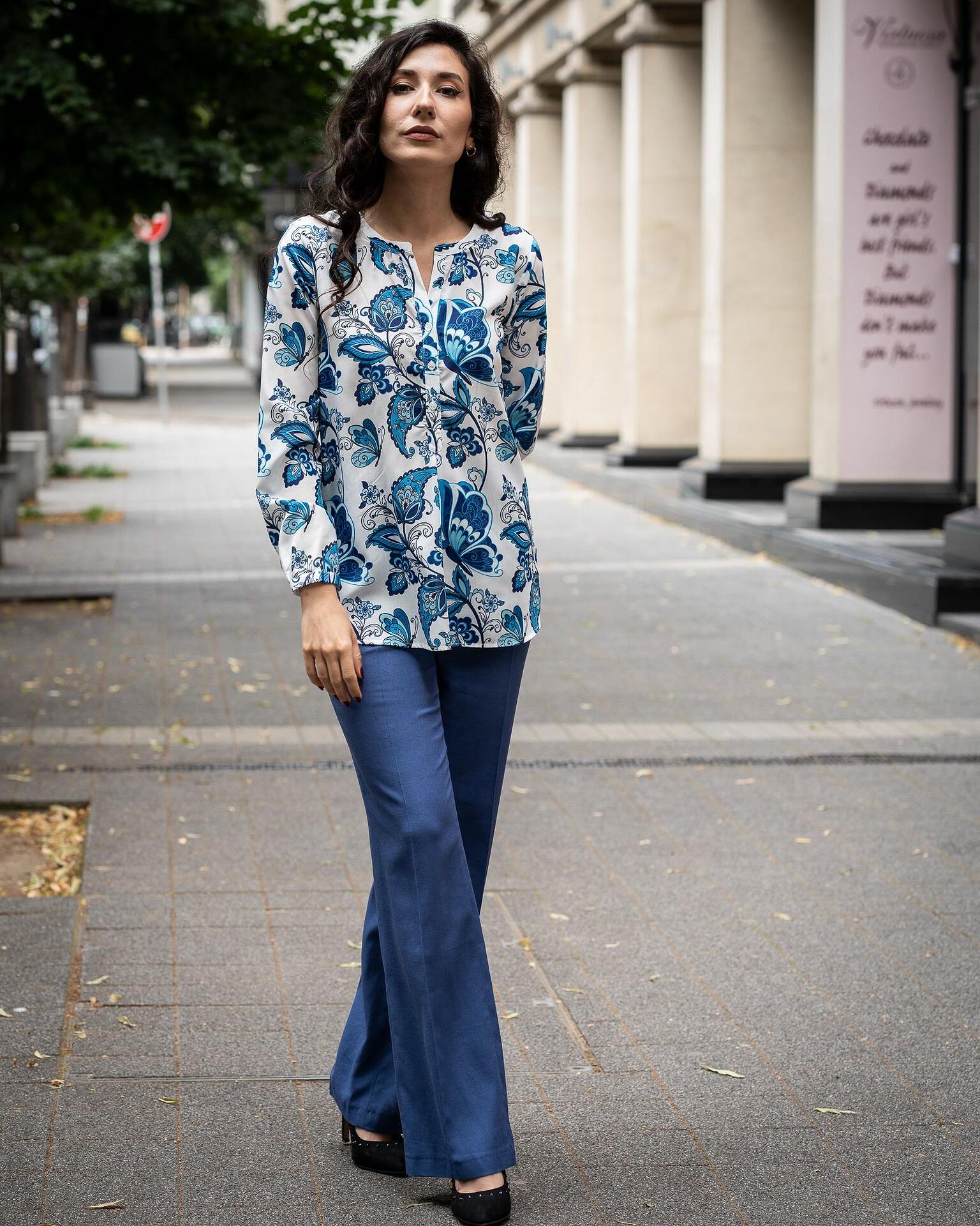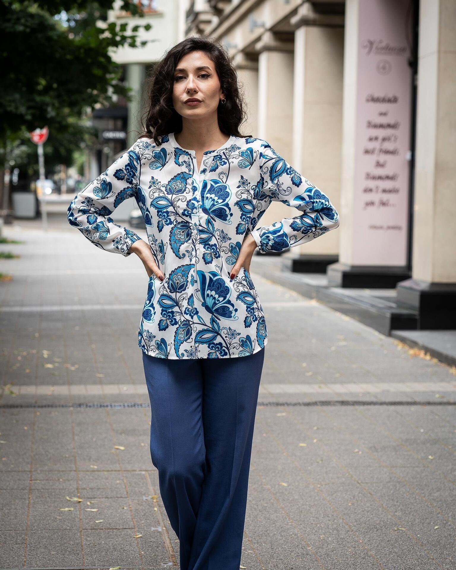 - Комбинация от свободна дамска блуза-туника от щампа и ленен панталон с широк крачол