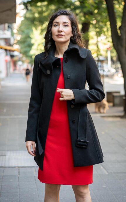 Комбинация от асиметрично палто с голяма яка и рокля с джобове и трапецовиден силует