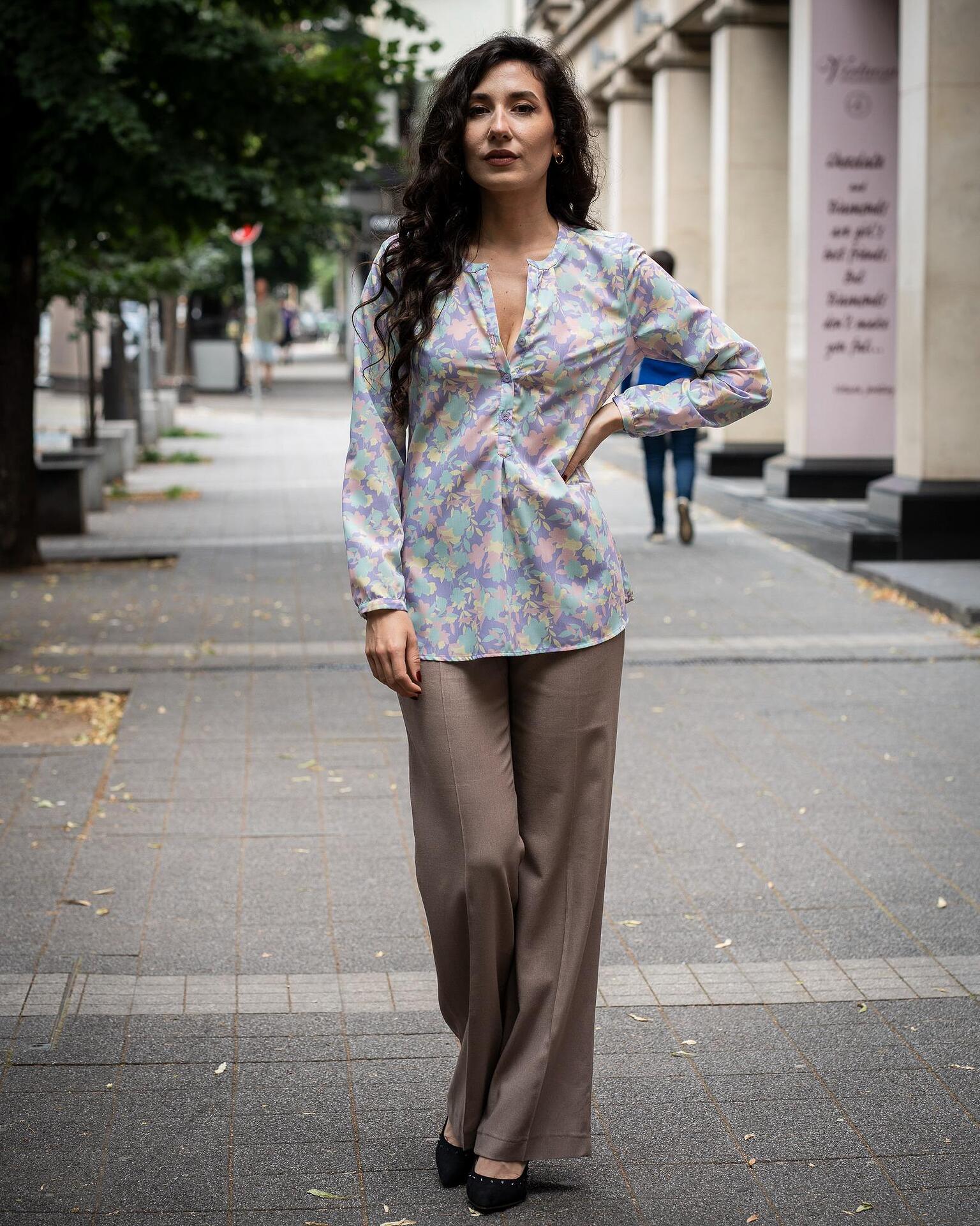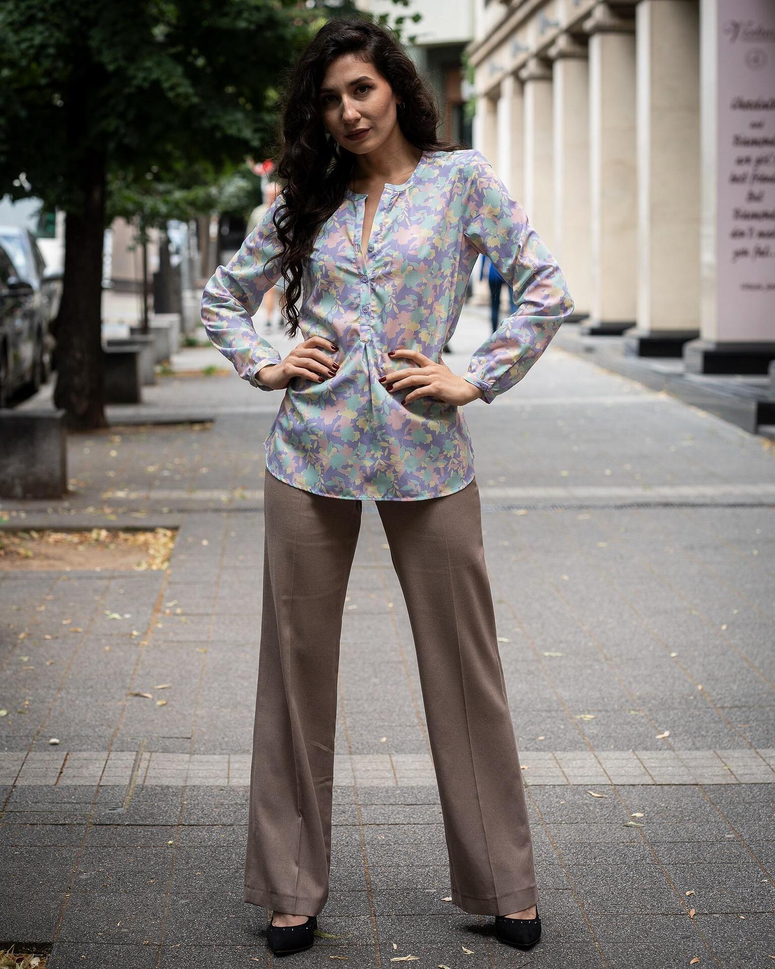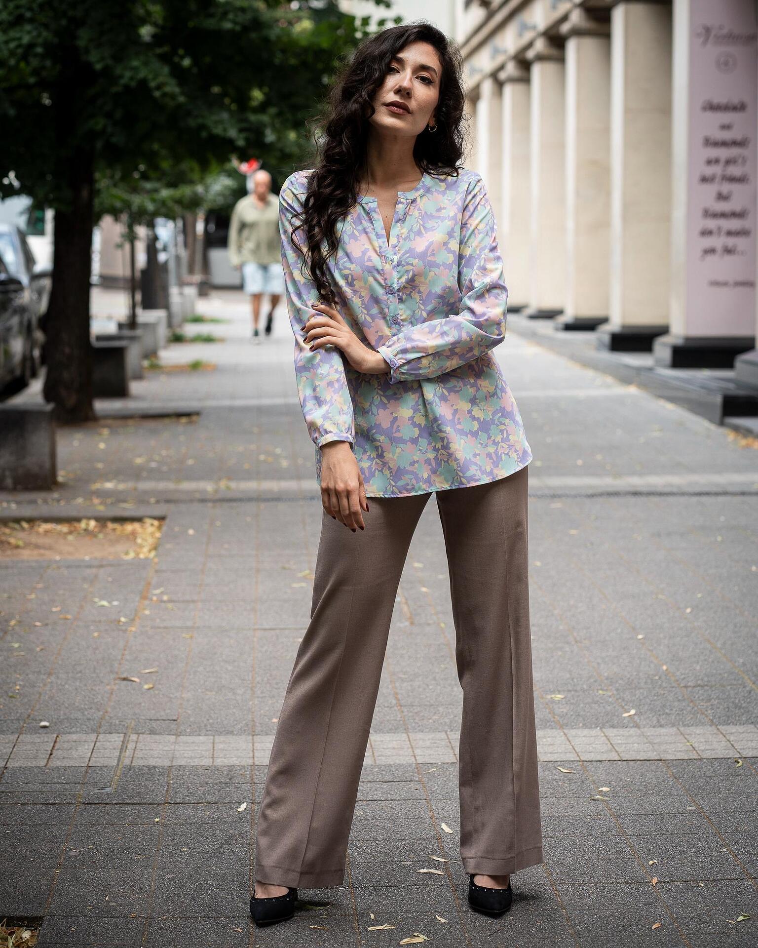 - Комбинация от свободна дамска блуза-туника от щампа и ленен панталон с широк крачол