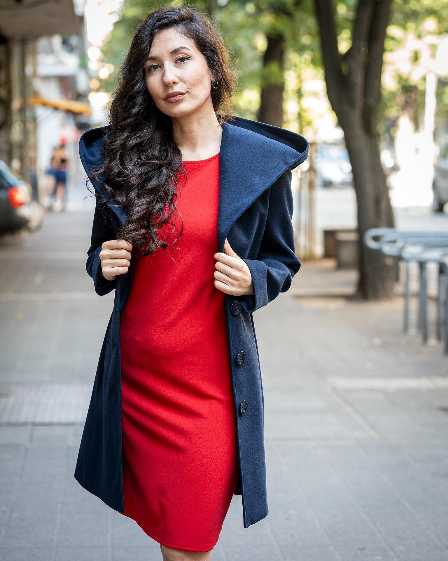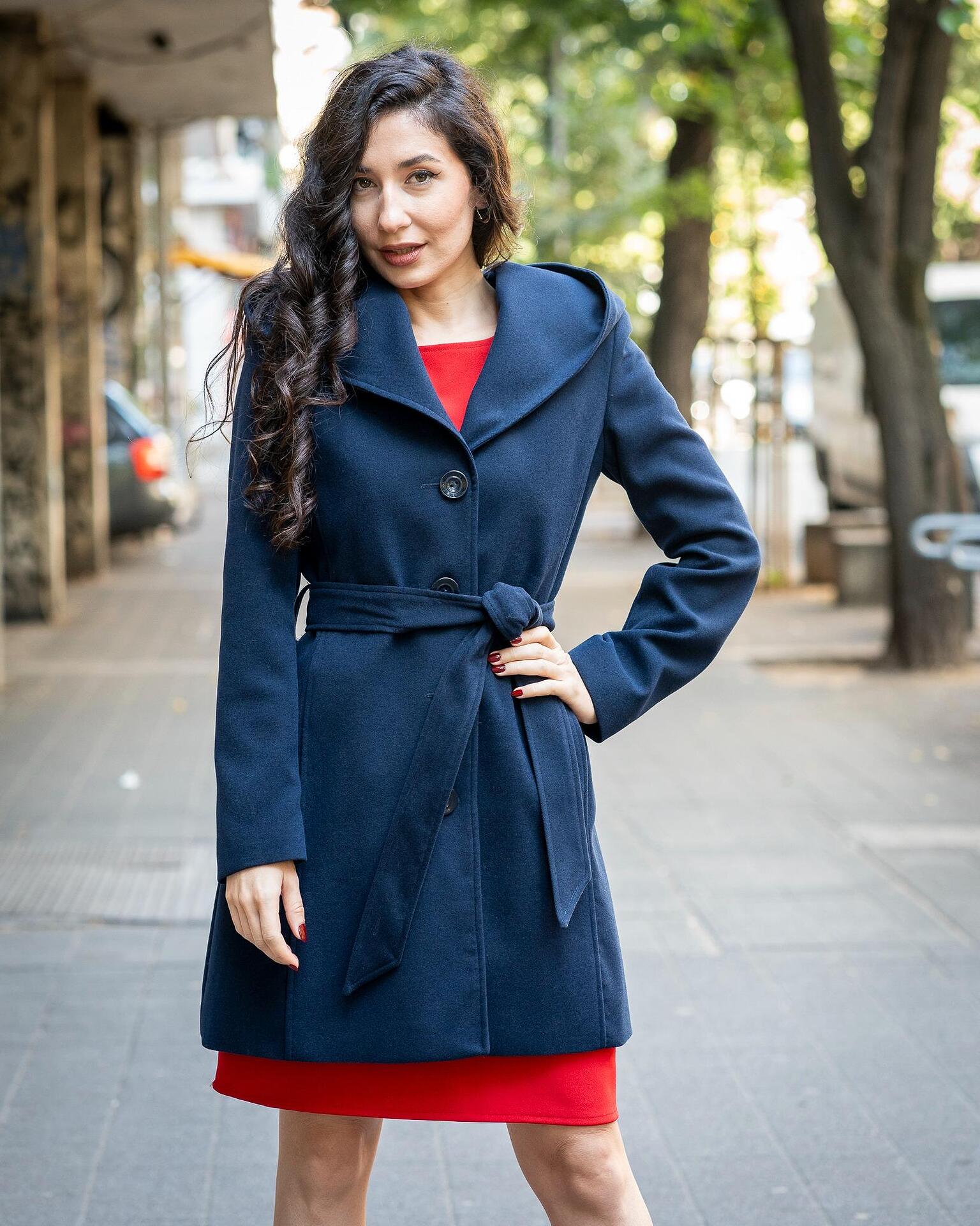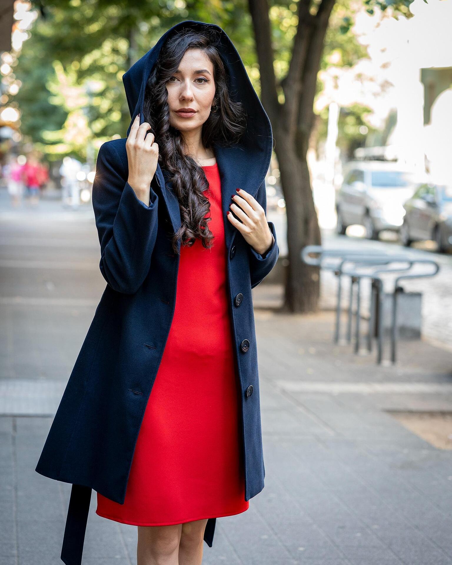 - Комбинация от вталено дамско палто с качулка и подвижен колан и рокля с джобове и трапецовиден силует