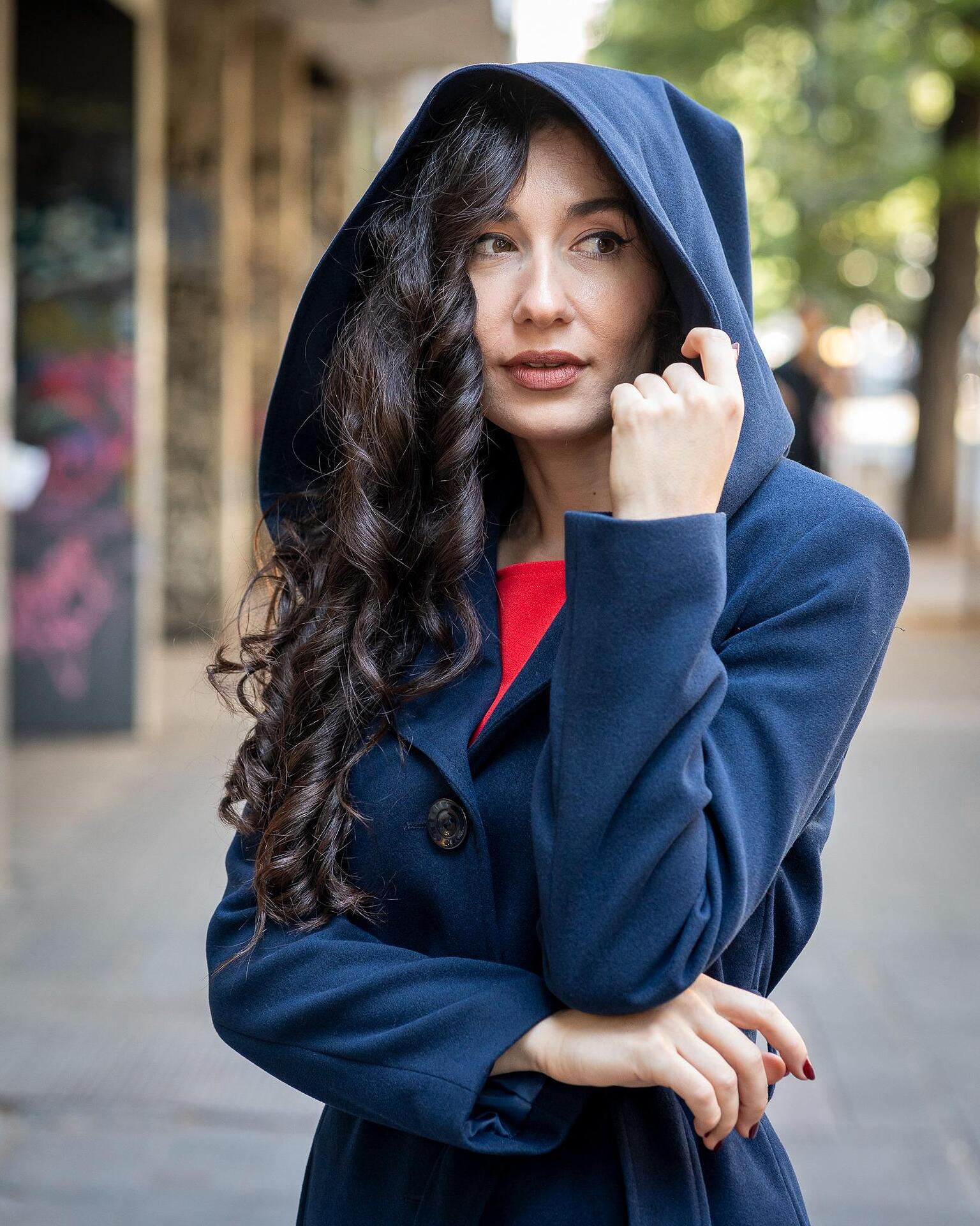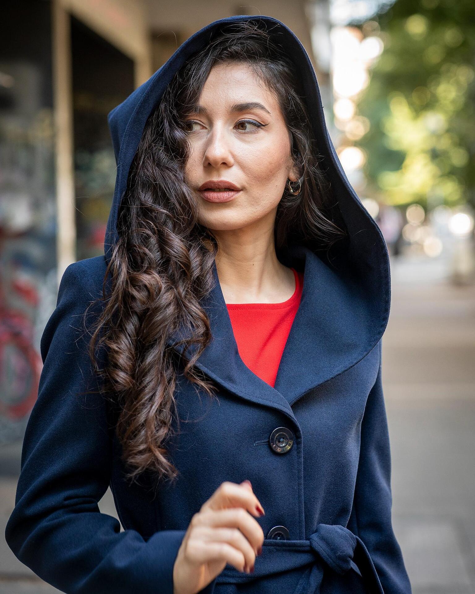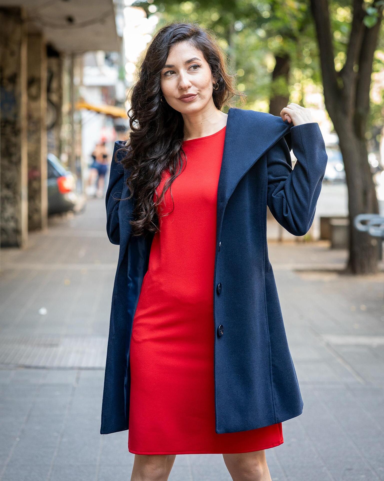 - Комбинация от вталено дамско палто с качулка и подвижен колан и рокля с джобове и трапецовиден силует