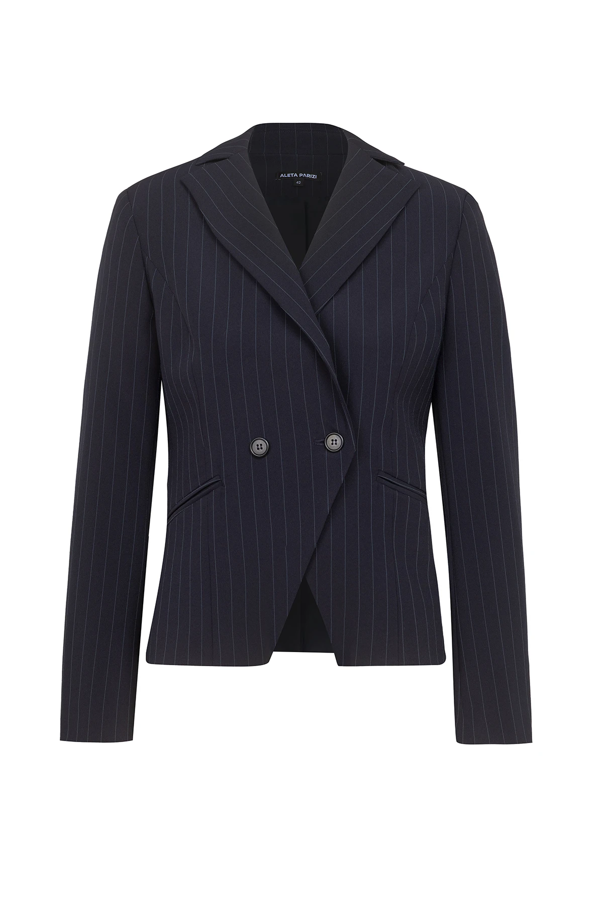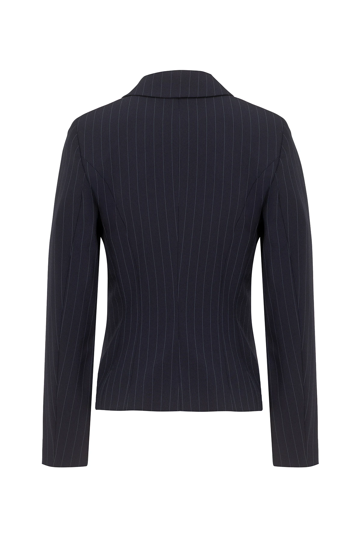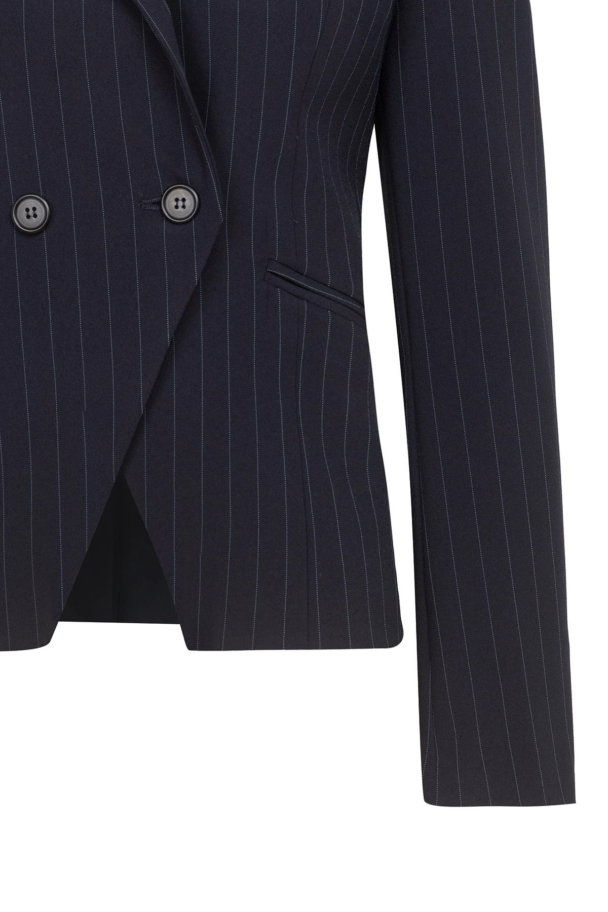 Дамски костюм от сако с остър ревер и срязване в талията и тесен дамски панталон