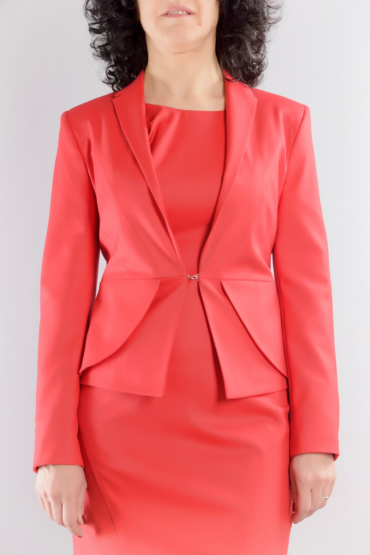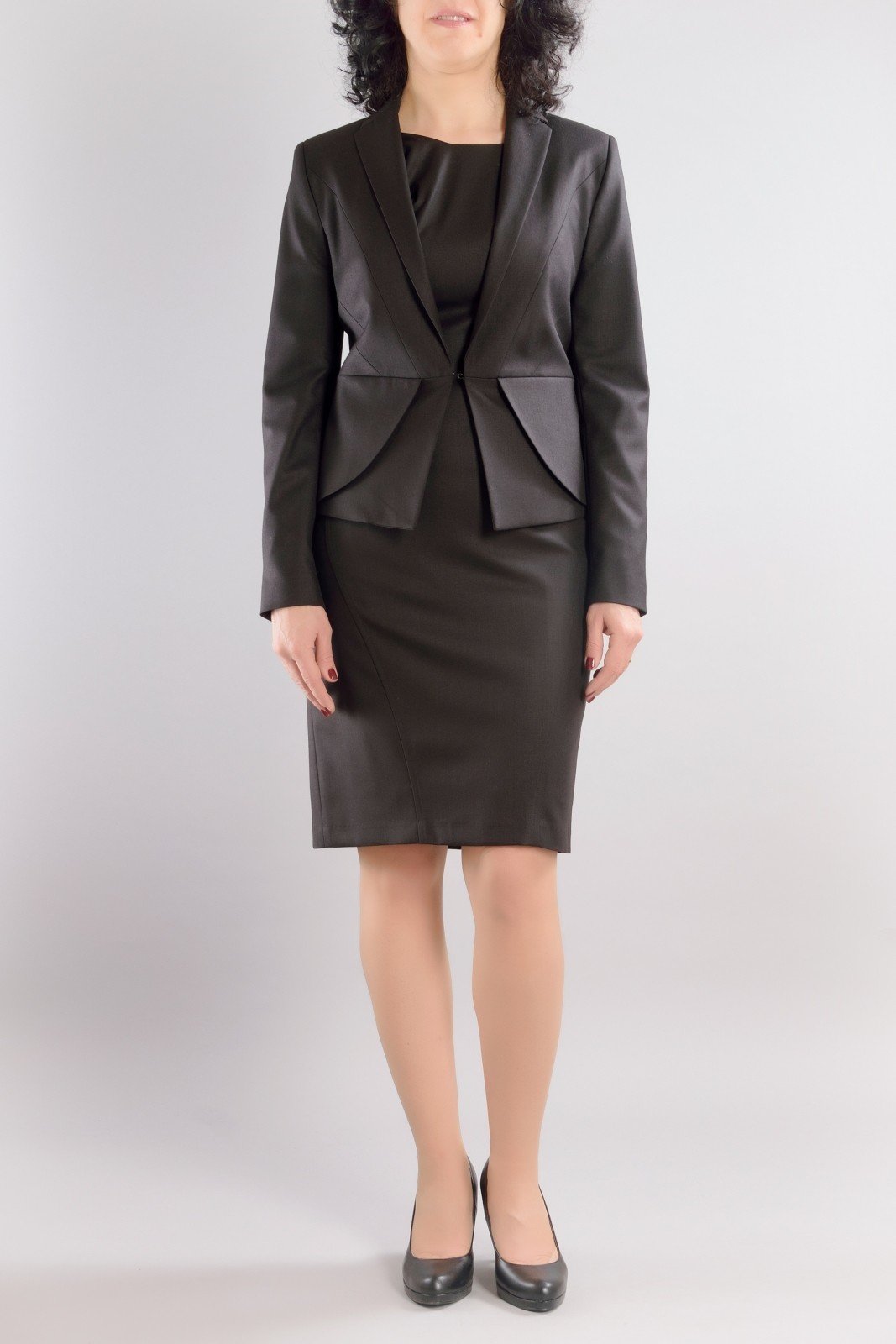 • Костюм от вталено сако със срязване в талията, с декоративни платки,модел 164-1 и вталена женствена рокля, с асиметрични чупки на деколтето, модел 5015-2.