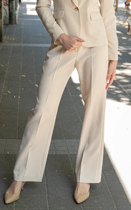• Дизайн: Широк крачол (тип Palazzo) с висока талия и двойно закопчаване