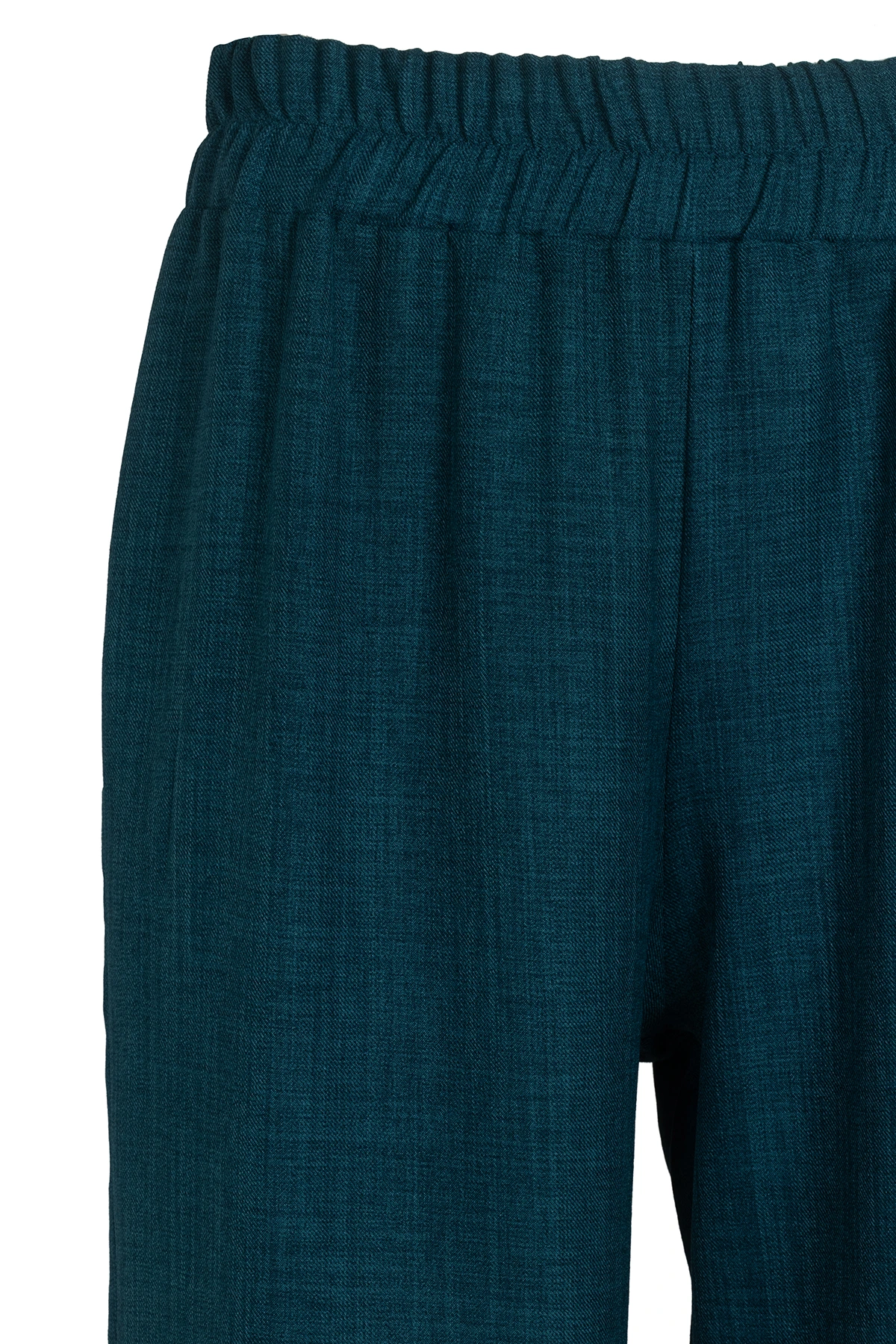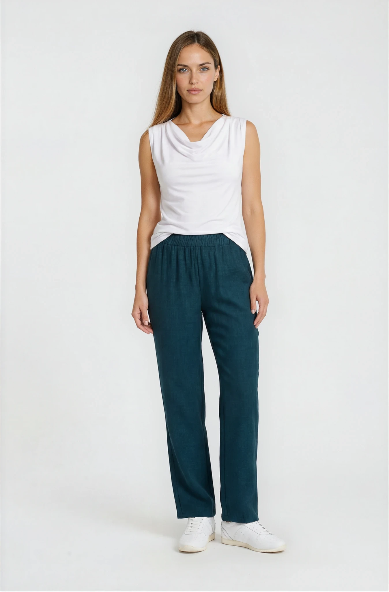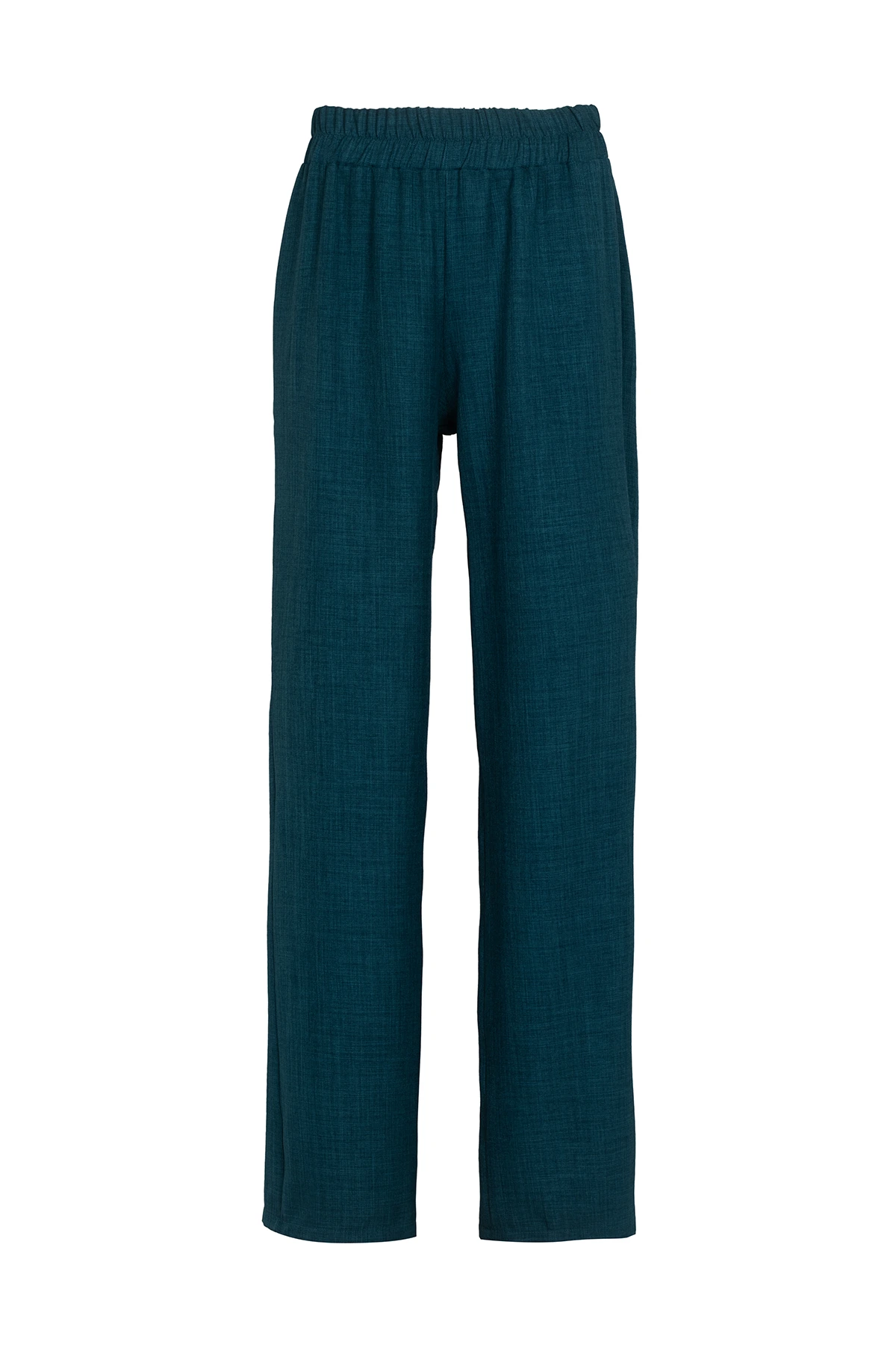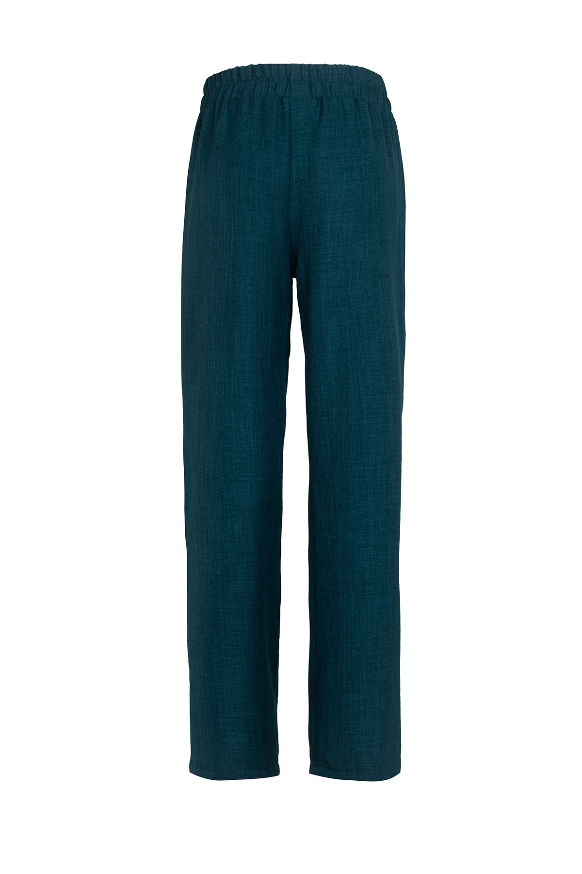 Този широк дамски панталон в дълбок тъмнозелен нюанс (тип петрол) е създаден за жените, които търсят лекота в ежедневието си. Благодарение на комбинацията от естествени материи и свободна кройка, моделът осигурява прохлада и удобство през целия ден, като същевременно изглежда елегантно и модерно.