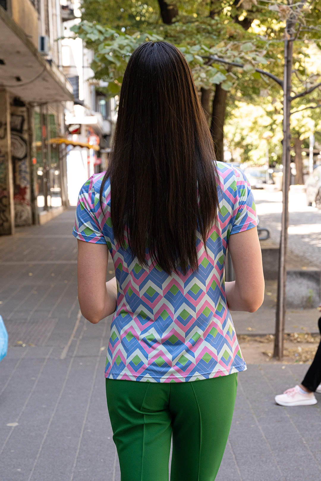 - Трикотажна блуза с къс ръкав и „гръцко” деколте