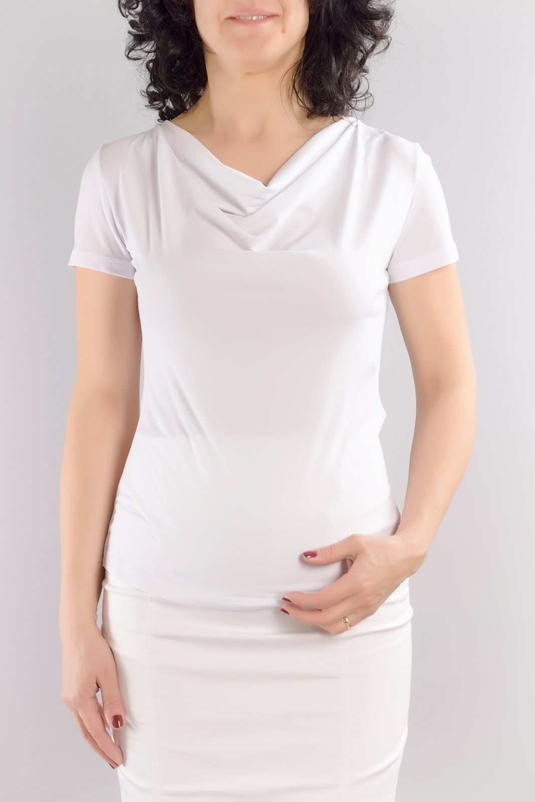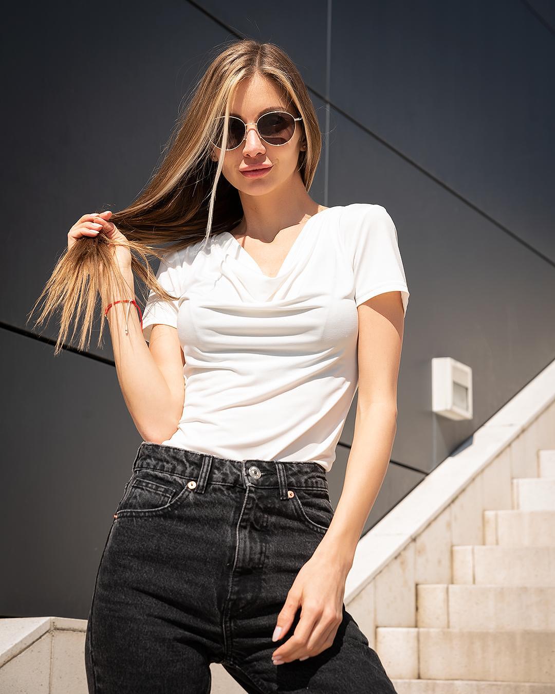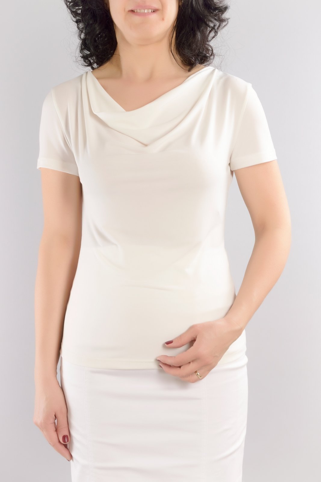 • Трикотажна блуза с къс ръкав и „гръцко” деколте