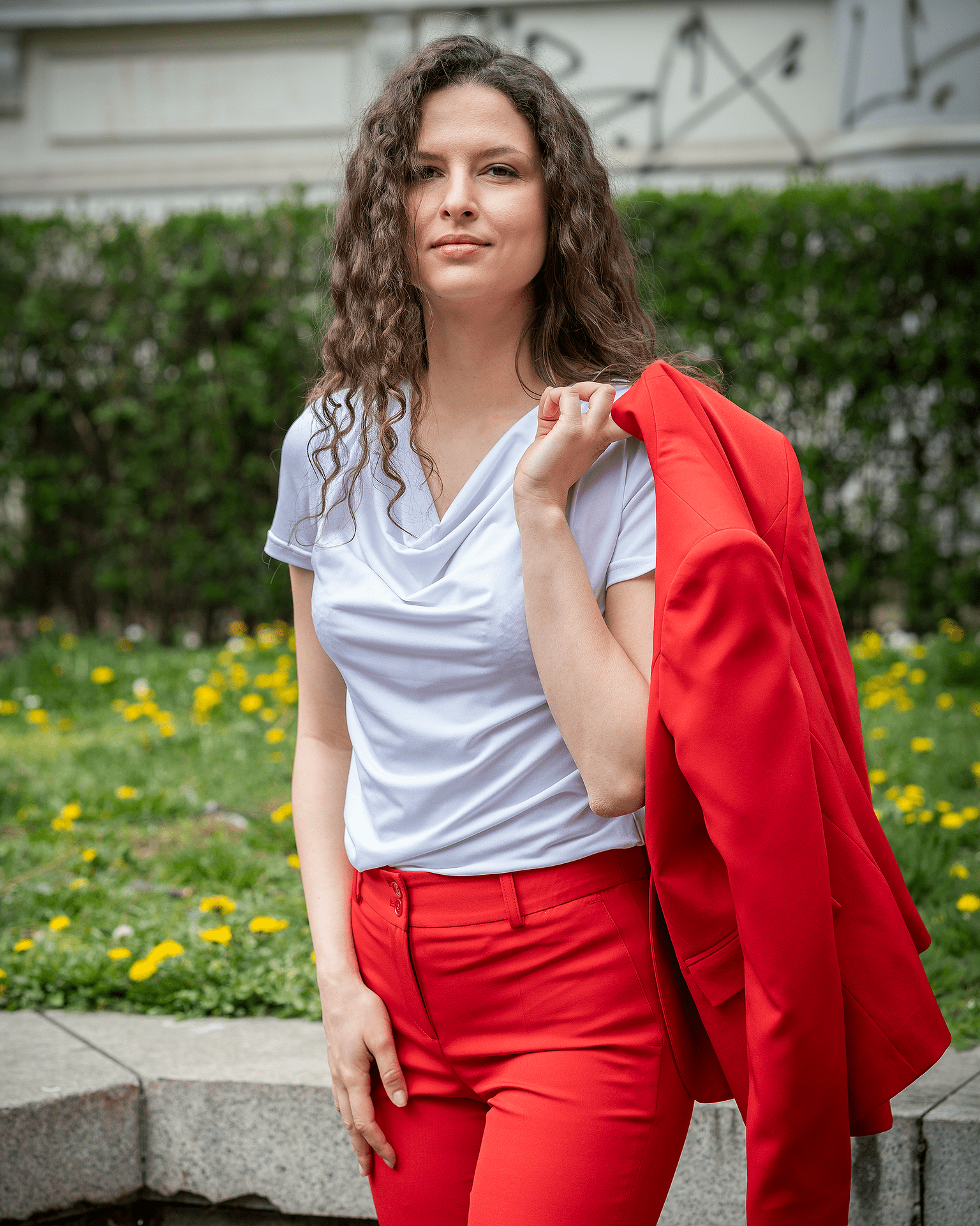 - Трикотажна блуза с къс ръкав и „гръцко” деколте, модел 771 М-10.