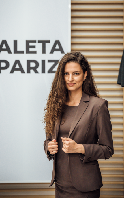 Моделът е висок 166 см и е облечен в размер 42 (BG) / 36 (EU).