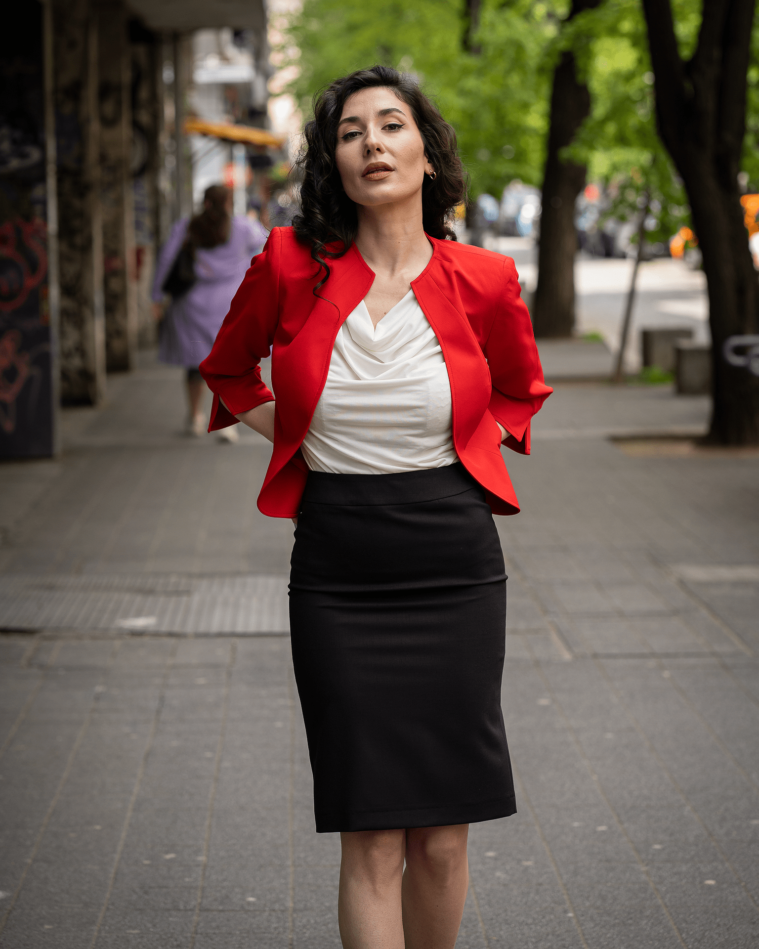 - Състав: 97% полиестер, 3% еластан; хастар: 100% полиестер.